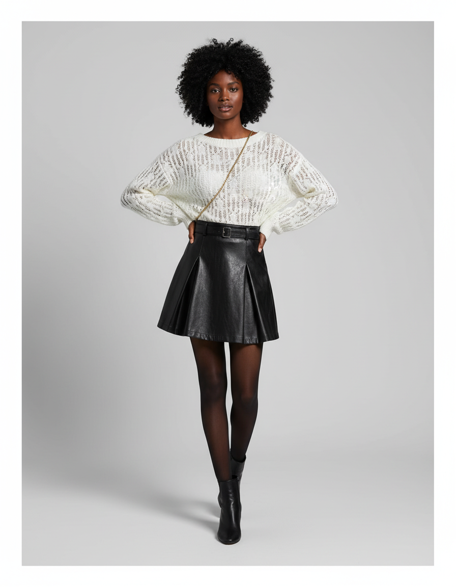 La Jupe Patineuse en Simili Cuir Noir est la pièce maîtresse d'un dressing moderne et polyvalent. Pour une sortie décontractée mais sophistiquée, associez-la à un pull en maille ajourée et des bottines, comme sur cette image, pour un look résolument chic et confortable. En soirée, transformez-la avec un top en soie fluide, des talons aiguilles et des bijoux minimalistes pour une allure glamour. Pour un style plus audacieux, osez le contraste avec un t-shirt graphique et une veste en jean, prouvant sa capacité à s'adapter à toutes vos envies.
