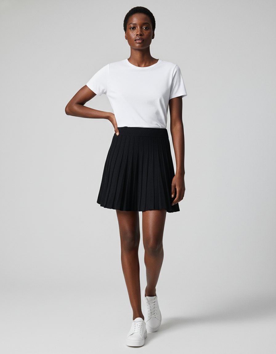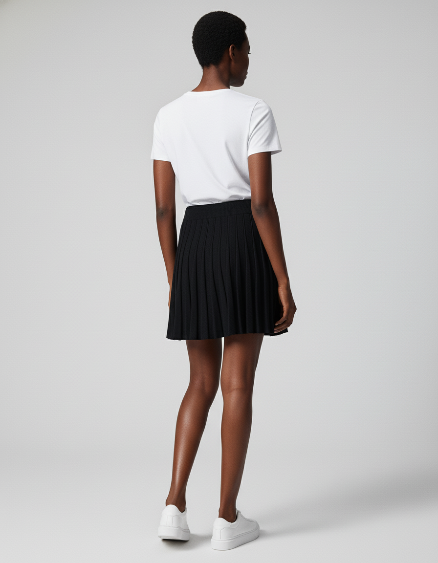 Conçue dans un noir intemporel et un style minimaliste épuré, la Jupe Patineuse est la toile vierge de votre créativité. Pour un look quotidien chic et décontracté, associez-la à un t-shirt blanc impeccable et des baskets épurées, comme sur l'image, pour une allure fraîche et moderne. En soirée ou pour une occasion plus sophistiquée, transformez-la avec un chemisier en soie, un pull fin en cachemire ou un blazer structuré, complété par des bottines ou des escarpins. Sa polyvalence en fait le choix parfait pour passer du bureau à un dîner, toujours avec style.