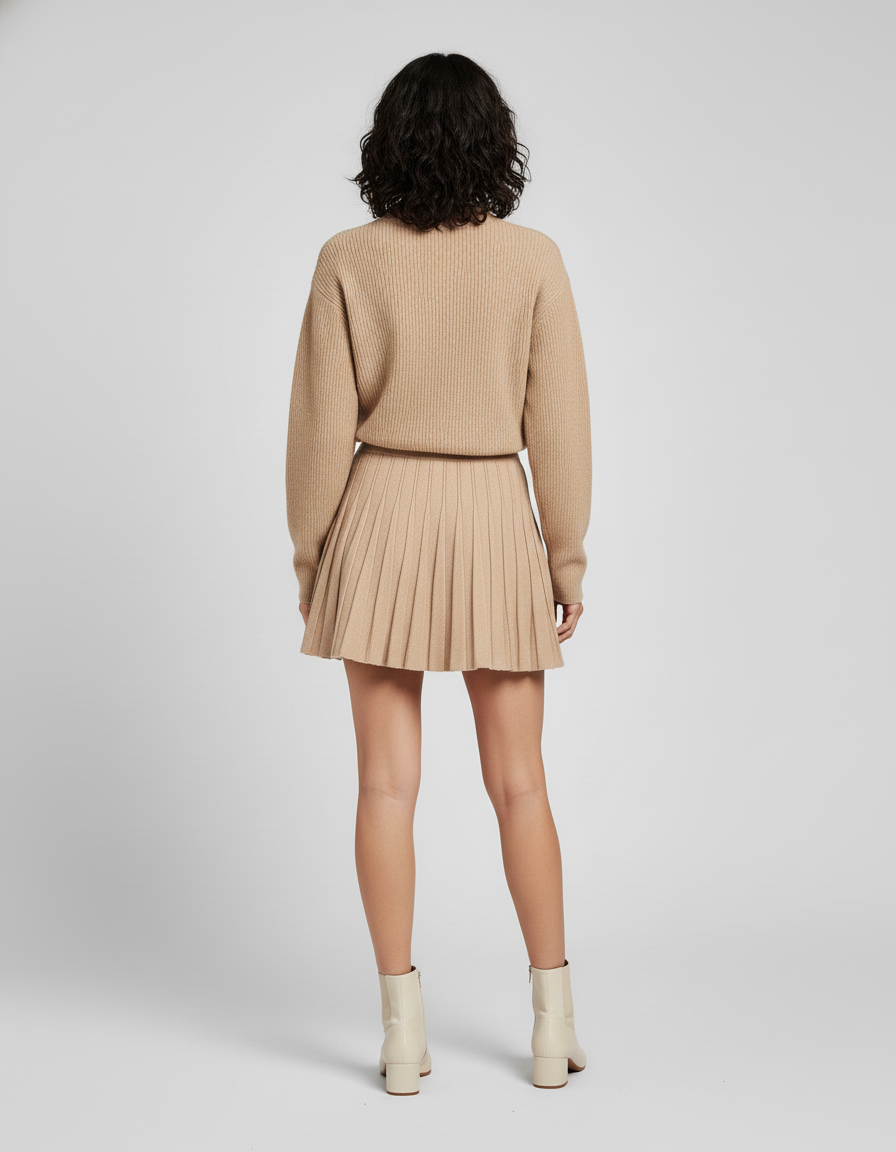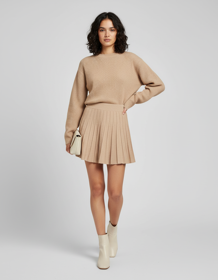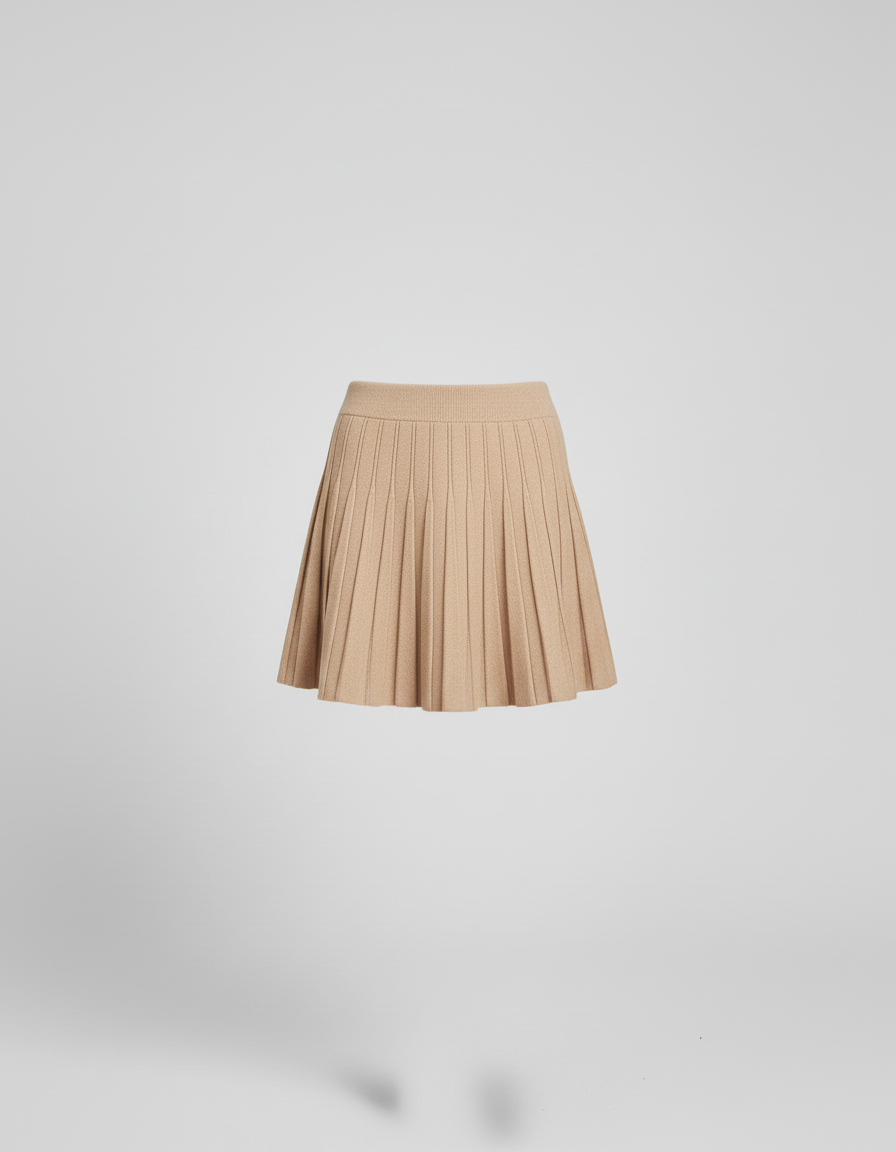 Explore effortless style with our charming pleated knit skirt, perfect for a chic and comfortable ensemble.