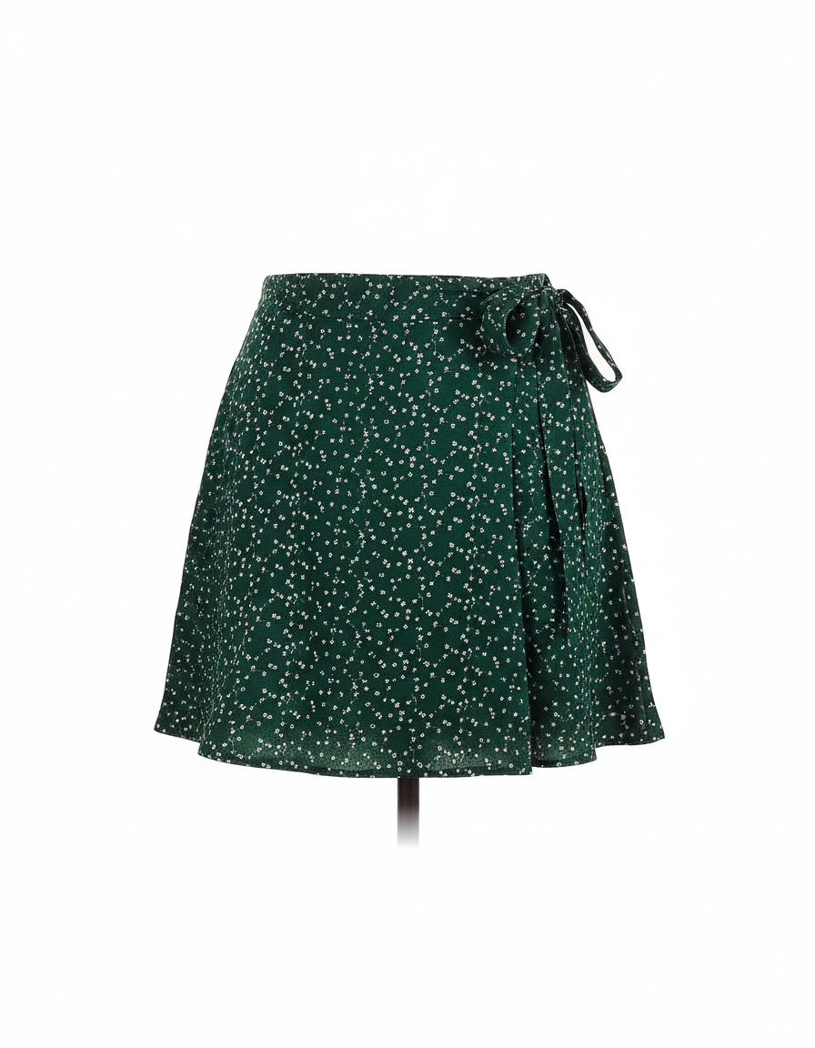 Cette jupe patineuse à pois est un modèle portefeuille court. Elle présente un motif à petits pois et une coupe évasée.