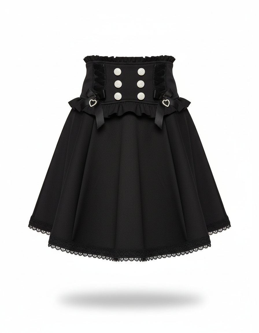 Cette jupe patineuse avec bretelle est de couleur noire et intègre des bretelles. Elle présente un empiècement structuré à la taille orné de boutons.