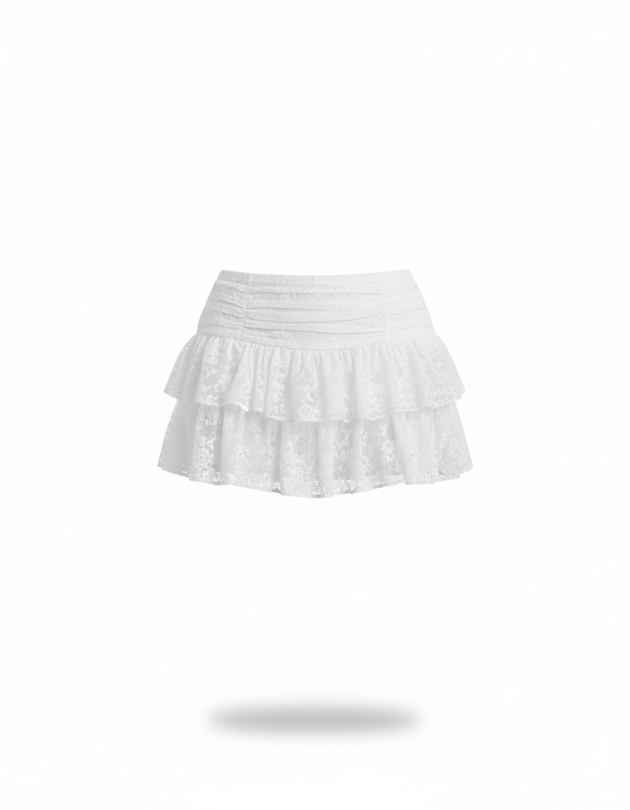 Cette jupe patineuse est de couleur blanche et confectionnée en dentelle. Elle présente une coupe courte avec des volants superposés.