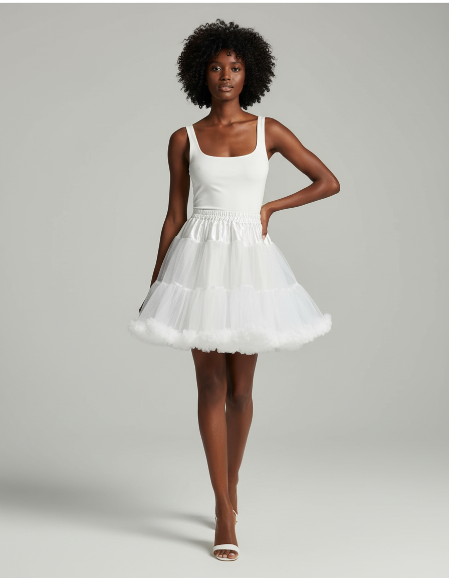 Confectionnée avec un tulle aérien de la plus haute qualité et une finition moelleuse incomparable, cette jupe offre un volume parfait sans jamais compromettre votre élégance. Sa silhouette patineuse intemporelle, associée à son blanc immaculé, crée un mouvement fluide et captivant à chaque pas. Loin des confections éphémères, notre jupe se distingue par son design haut de gamme et son confort exceptionnel, vous assurant une allure impeccable et un bien-être durable. Une pièce essentielle qui réinvente le luxe avec une touche de fantaisie chic.