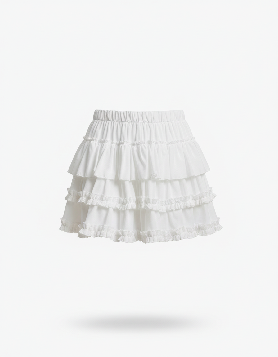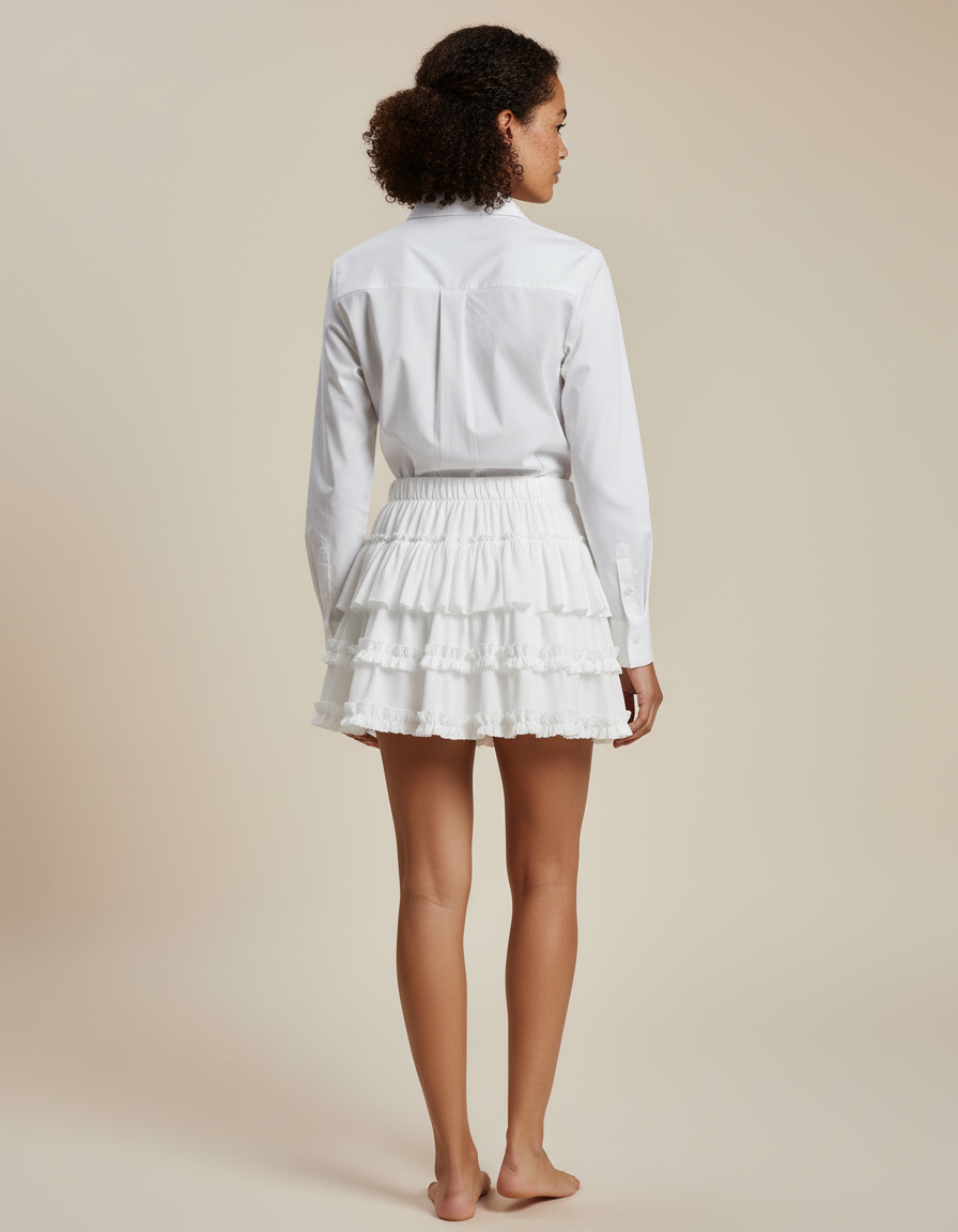 Cette jupe courte présente une coupe évasée avec plusieurs niveaux de volants. Elle est de couleur blanche et possède une taille froncée.