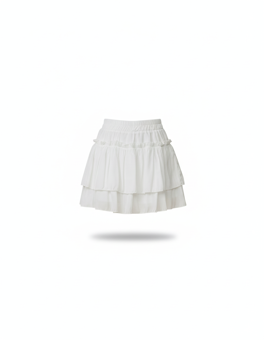 Cette jupe courte présente une coupe patineuse avec plusieurs niveaux de volants. Elle est de couleur blanche et possède une taille élastiquée.