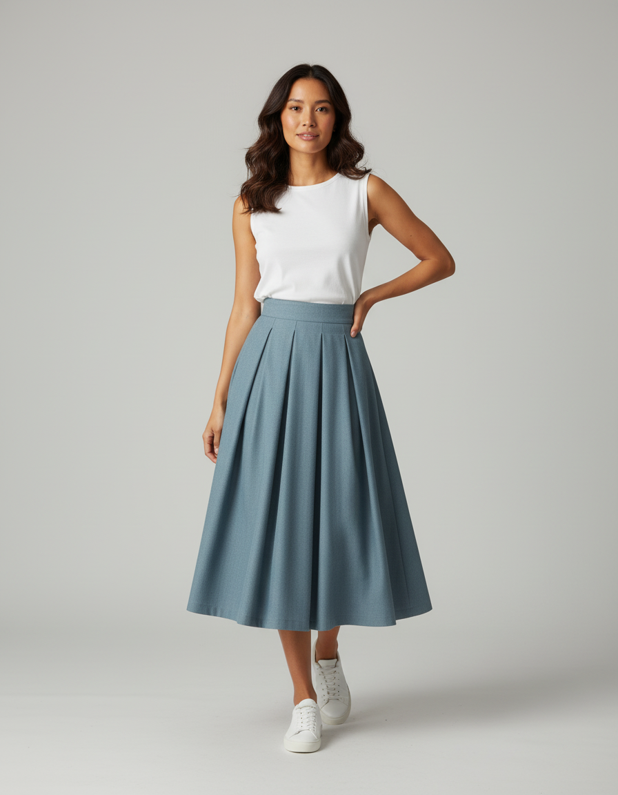 Pour le bureau, associez-la à une blouse en soie et des escarpins pour une élégance intemporelle. En soirée, transformez votre look avec un top ajusté et des bijoux discrets. Et pour un style plus décontracté mais toujours sophistiqué, osez la porter avec un fin pull en cachemire et des bottines ou même des baskets blanches épurées, comme le suggère notre styliste. La Jupe Patineuse Bleu-Gris Plissée Élégante est la promesse d'une silhouette impeccable et d'une polyvalence sans effort, idéale pour la femme moderne active qui valorise autant le style que le bien-être.
