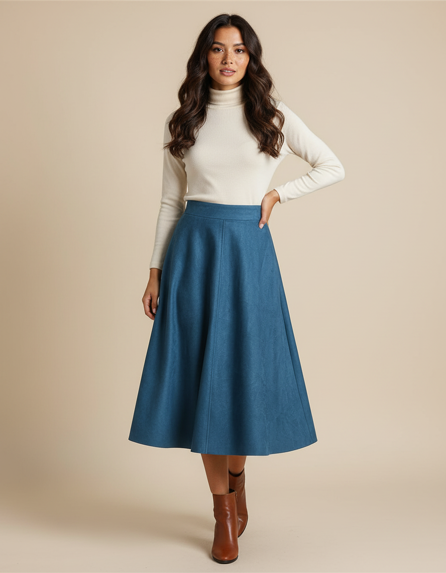 Jupe Patineuse Bleu Pétrole Daim Élégante à Coupe Évasée