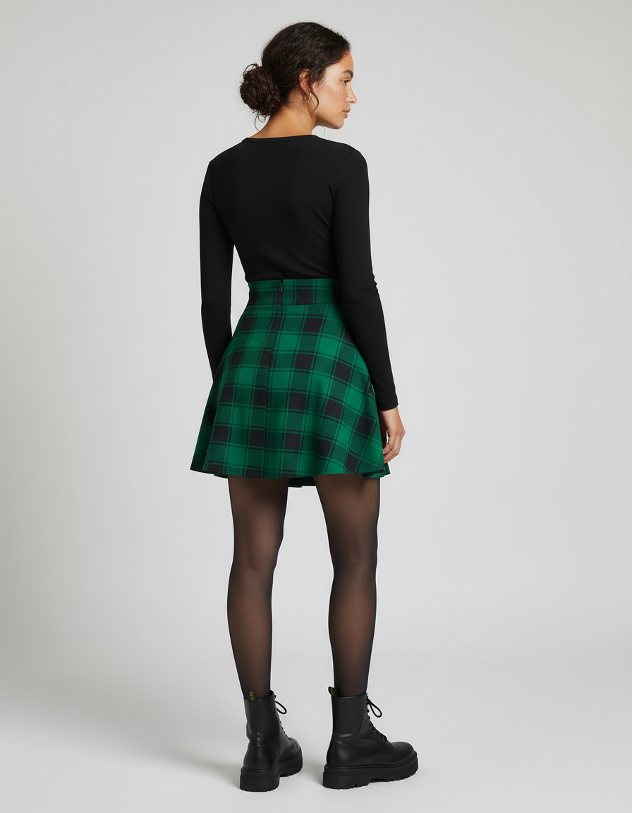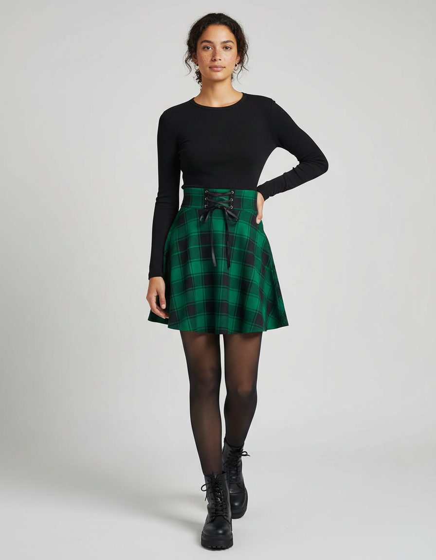 Notre Jupe Patineuse Carreaux Lacée Fluide est la pièce maîtresse pour un dressing audacieux et versatile. Son motif écossais vert profond et son laçage corseté à la taille insufflent une touche rock irrésistible. Associez-la à un t-shirt graphique et des bottes chunky pour une allure grunge affirmée en journée. Pour une soirée décontractée, optez pour un pull fin noir et une veste en cuir, créant un contraste chic et moderne. Sa coupe patineuse s'adapte à toutes vos envies, du brunch entre amis aux concerts improvisés, toujours avec caractère.