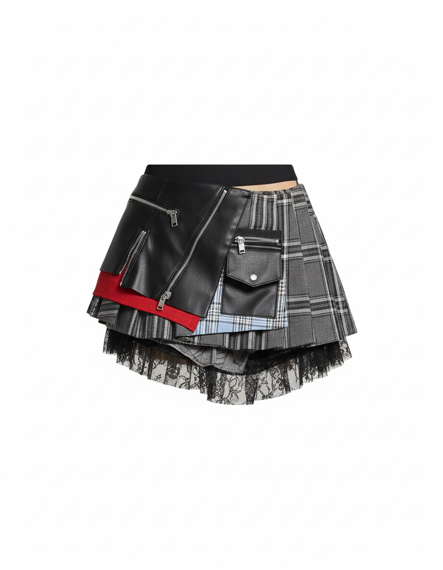 Cette jupe courte et superposée présente des motifs à carreaux et des éléments en similicuir noir. Elle est agrémentée de fermetures éclair visibles, de poches décoratives et d'une bordure en dentelle à l'ourlet.