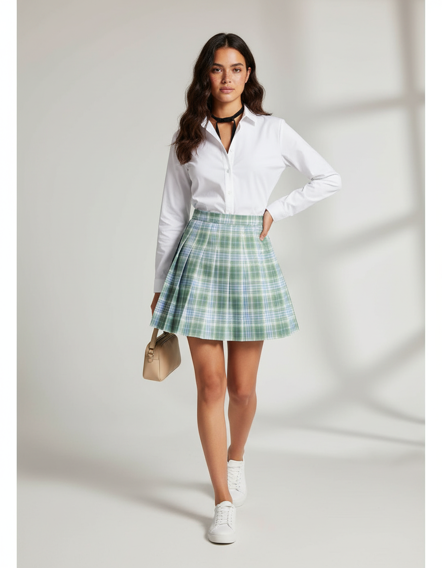 Adoptez un look frais et moderne avec cette jupe patineuse à carreaux plissée, parfaite pour toutes les occasions.