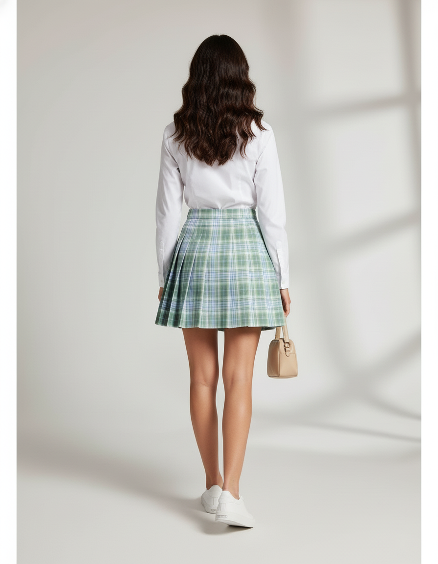 Ce qui la distingue ? Son motif carreaux multicolore, où les nuances de vert et de bleu s'entremêlent avec une sophistication joyeuse, réinventant le classique avec une touche contemporaine. Le polyester de qualité supérieure assure non seulement une tenue parfaite et une résistance aux plis, mais aussi un tombé fluide et léger. Chaque pli est minutieusement travaillé pour créer une silhouette flatteuse et dynamique, faisant de cette jupe la pièce maîtresse de votre garde-robe pour un luxe concret et un style inimitable.