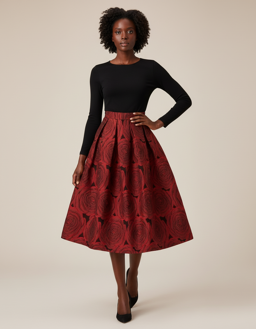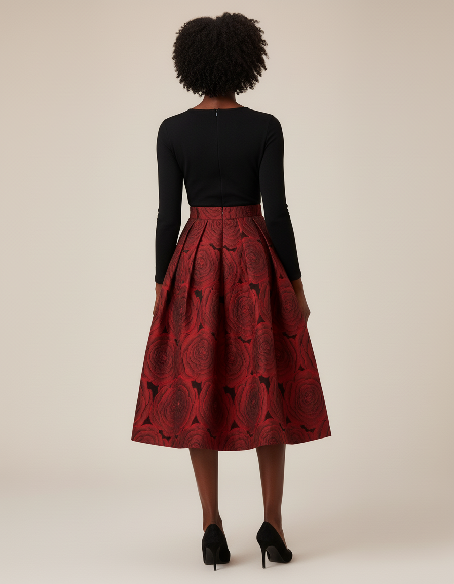 Cette jupe patineuse présente un motif floral avec des roses rouges sur un fond sombre. Sa coupe évasée offre un volume distinctif sous la taille.