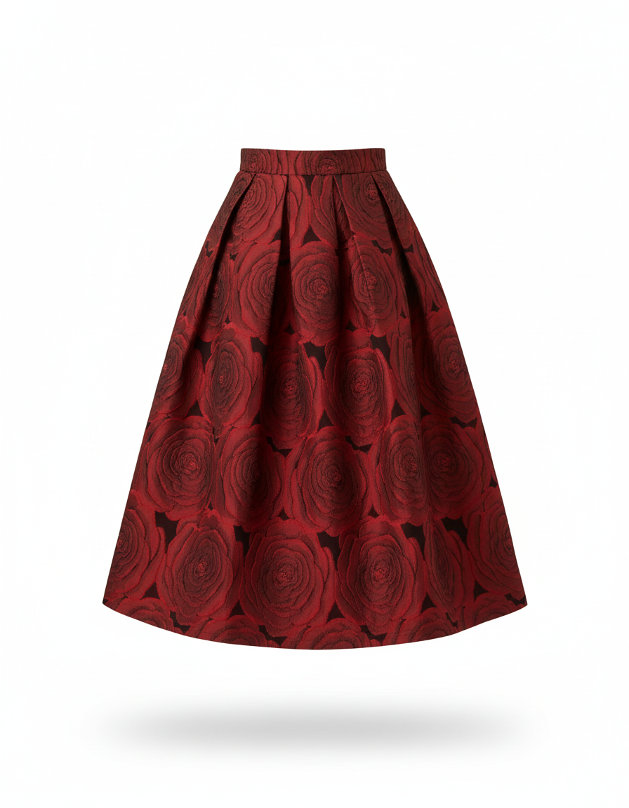 La Jupe Patineuse Cérémonie, dans son riche bordeaux orné de roses emblématiques, est conçue pour sublimer votre silhouette avec une aisance remarquable. Son tissu de qualité supérieure assure un tombé impeccable, offrant une tenue parfaite sans jamais restreindre vos mouvements. Que ce soit pour une danse légère ou une réception prolongée, vous apprécierez la liberté qu'elle procure, tout en conservant son allure structurée et son volume élégant. Chaque pas est une affirmation de grâce, chaque mouvement une expression de confiance, vous permettant de briller en toute occasion.
