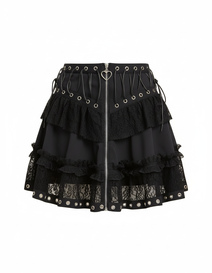 Conçue pour celles qui osent, notre Jupe Patineuse Dentelle Noire incarne l'essence du style rock avec une touche de féminité raffinée. Ses volants délicats en dentelle, ses œillets audacieux et son zip central en forme de cœur créent une silhouette distinctive et pleine de caractère. Fabriquée dans un tissu fluide et stretch de haute qualité, elle garantit un confort absolu et une liberté de mouvement inégalée, vous permettant de danser et de vous déplacer avec aisance. Son tombé impeccable met en valeur votre silhouette sans jamais restreindre.