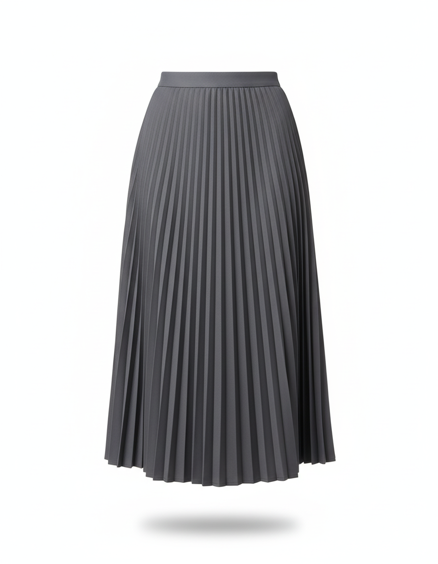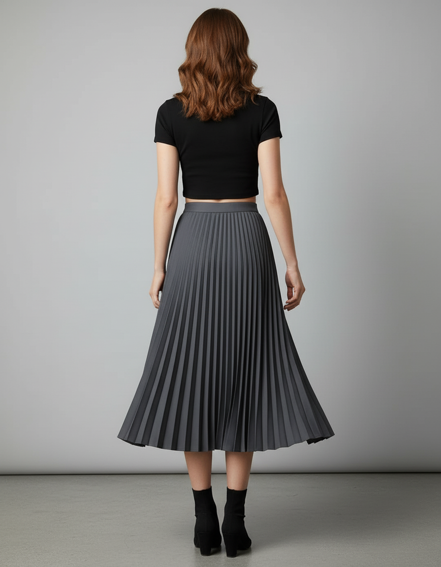 Cette jupe mi-longue présente des plis verticaux sur toute sa circonférence. La jupe est de couleur gris foncé et se positionne à la taille.