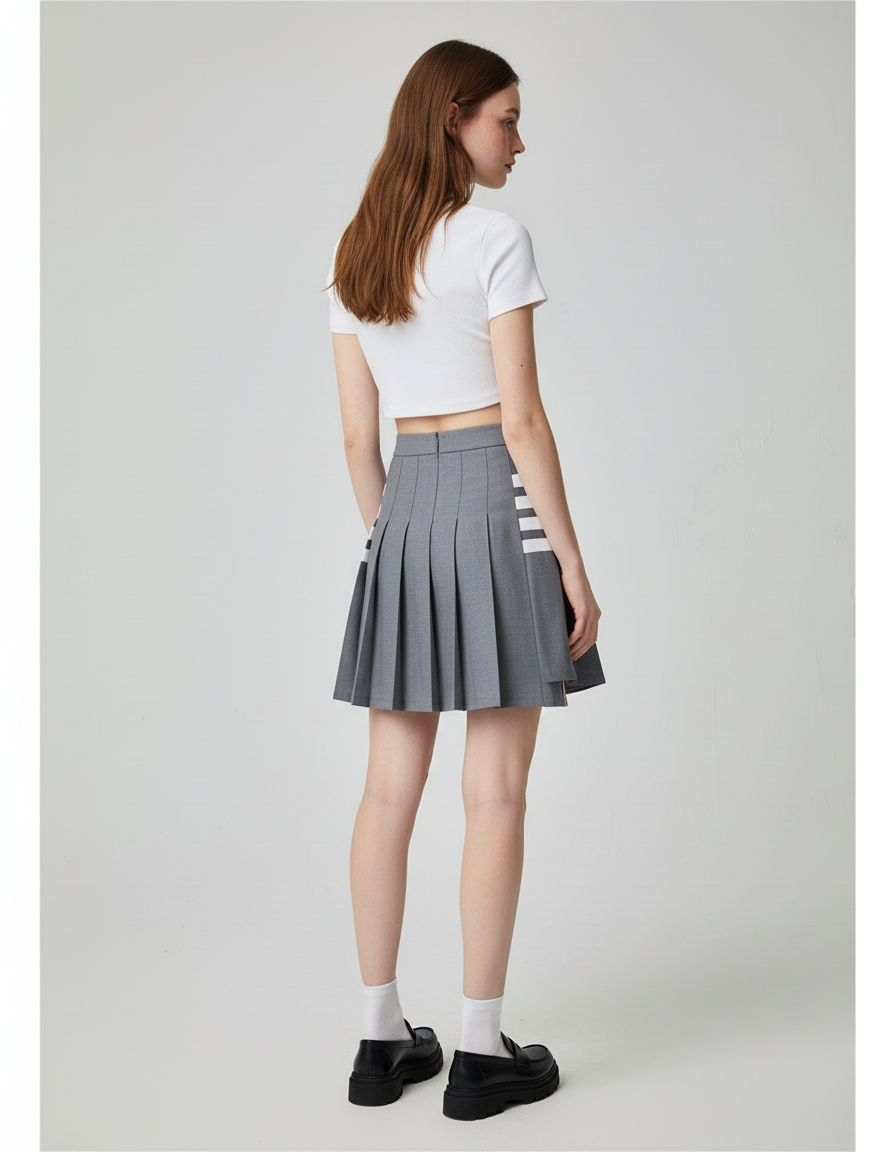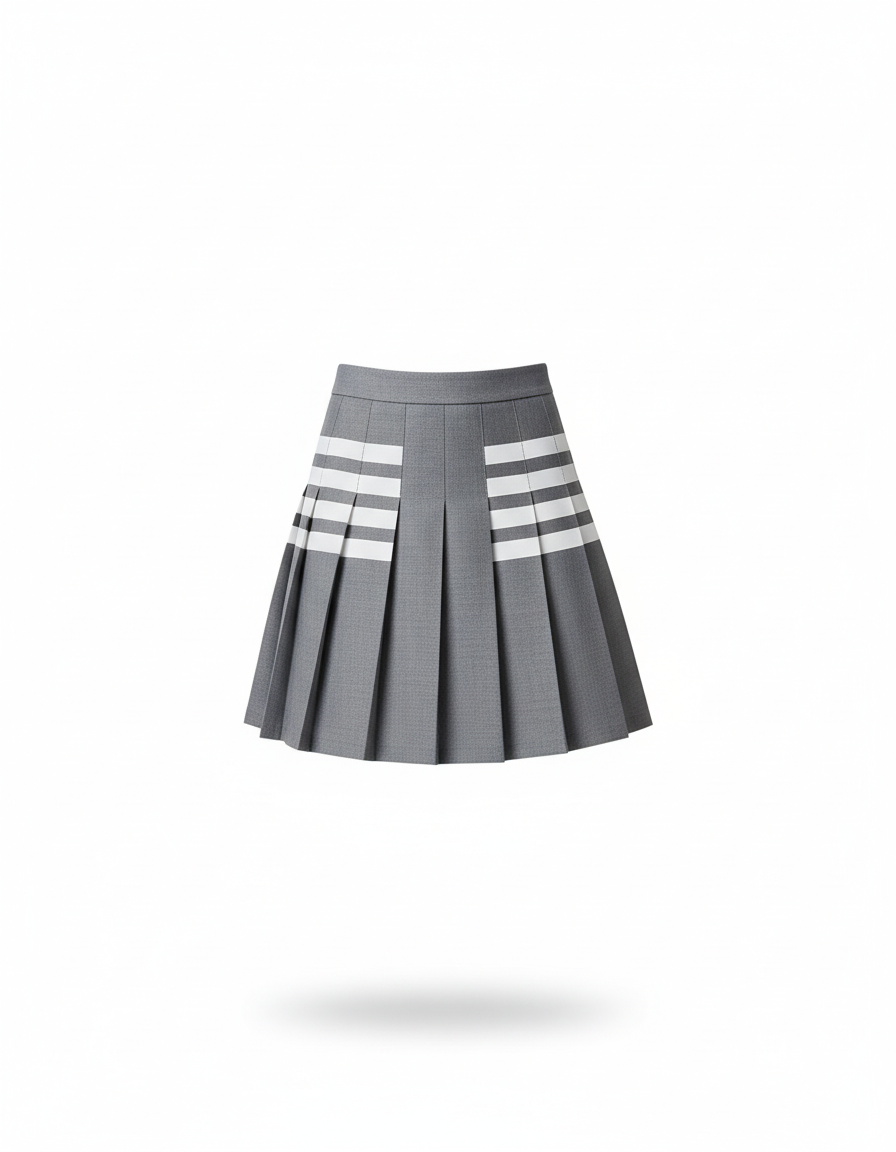 Cette jupe patineuse est une pièce plissée de couleur grise. Elle présente des bandes horizontales blanches sur les panneaux avant et une coupe courte.