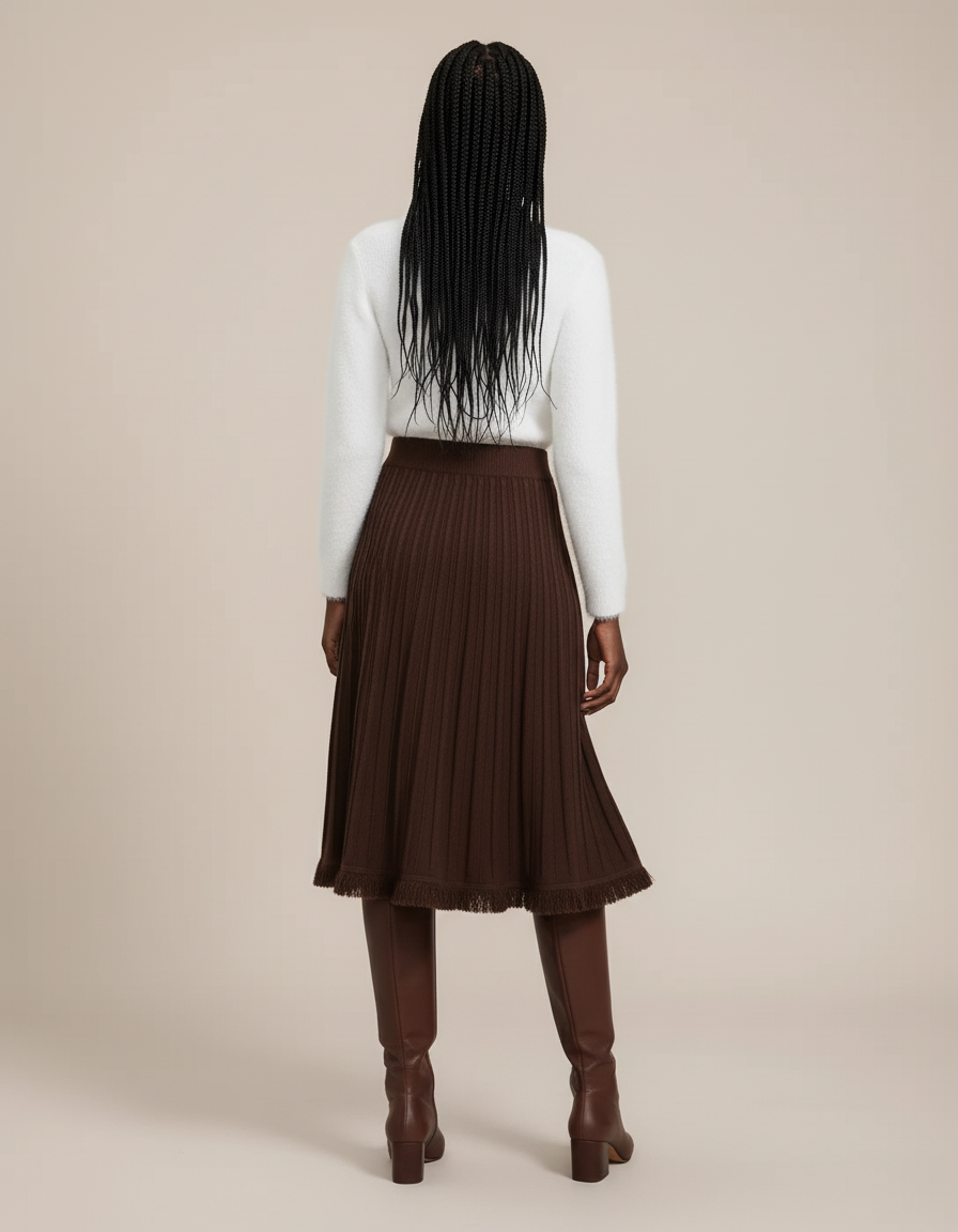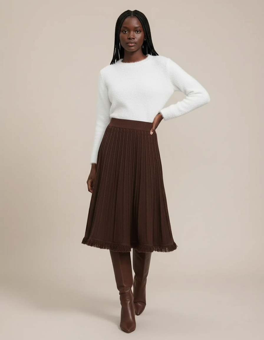 Sa teinte marron profond en fait un atout polyvalent de votre garde-robe. Pour un rendez-vous, associez-la à un chemisier en soie et des bottines élégantes pour une allure chic et séductrice. Au bureau, une blouse crème et un blazer structuré lui conféreront une touche professionnelle raffinée. Pour une sortie plus décontractée, un pull en cachemire douillet et des baskets blanches lui apporteront une modernité assumée. La Jupe Patineuse Maille Plissée Chic se prête à toutes les interprétations, affirmant votre style avec une élégance naturelle et une adaptabilité remarquable.
