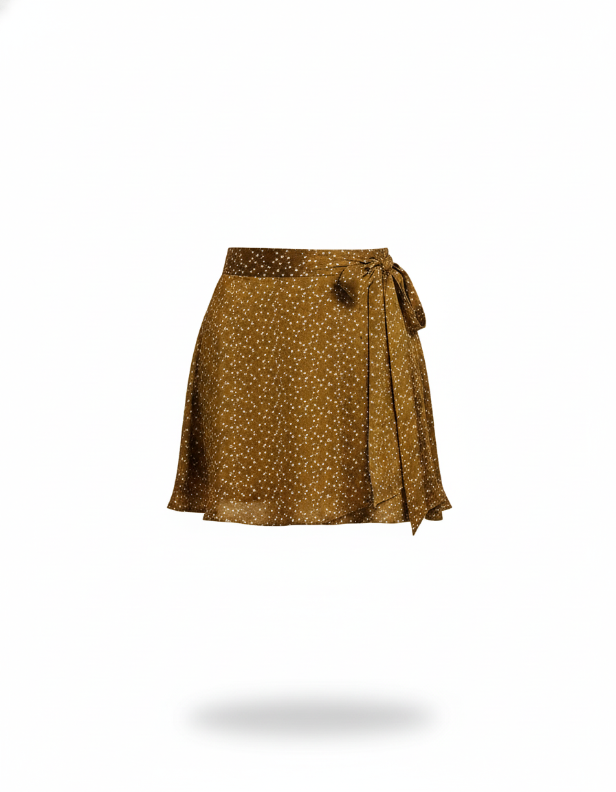 Cette jupe patineuse moutarde présente un design portefeuille avec une taille ajustable à nouer. Elle est confectionnée dans un tissu qui ne se froisse pas facilement.