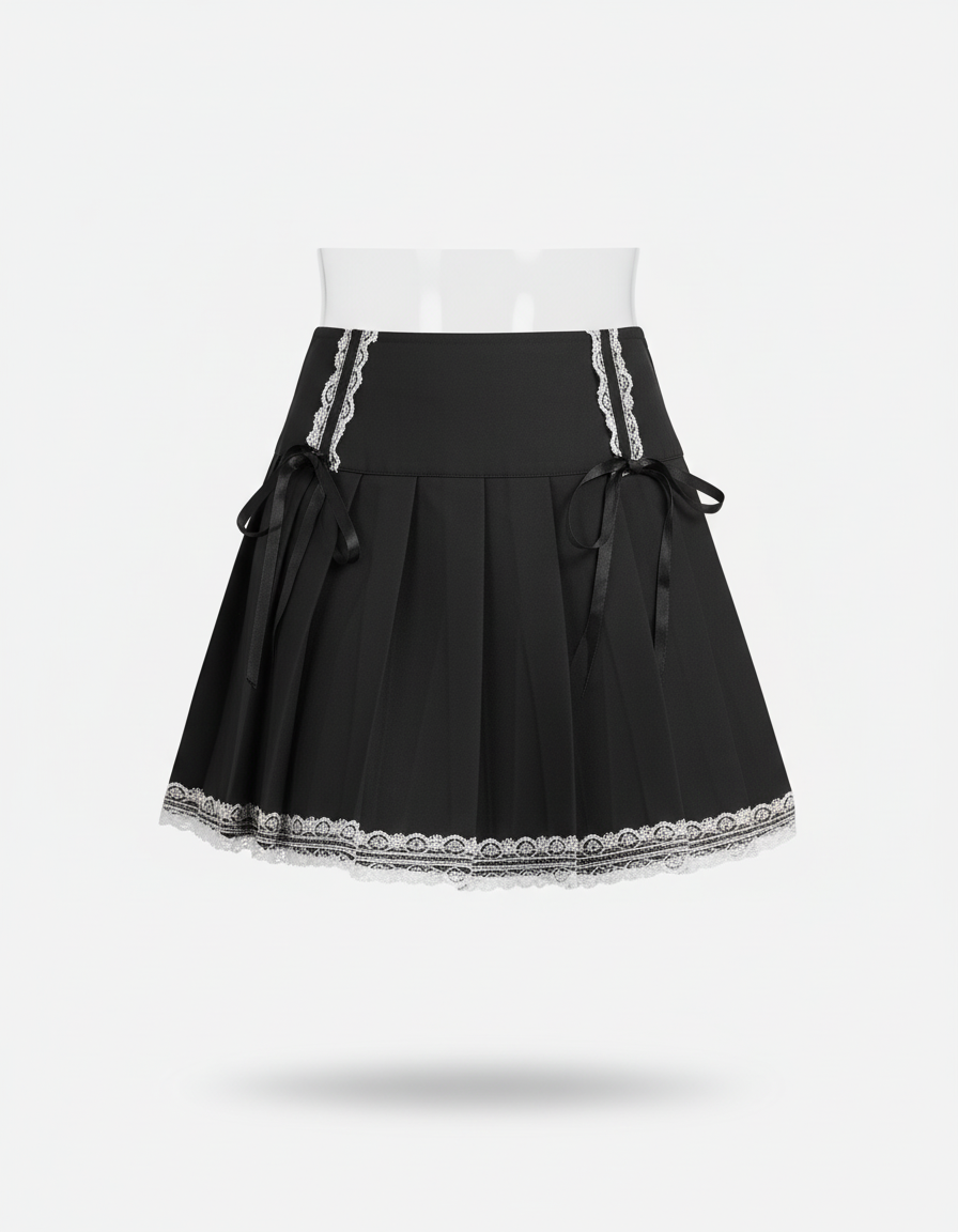 Cette jupe patineuse noire présente des plis et une bordure en dentelle blanche. Elle est courte et intègre des éléments décoratifs avec des rubans sur les côtés.
