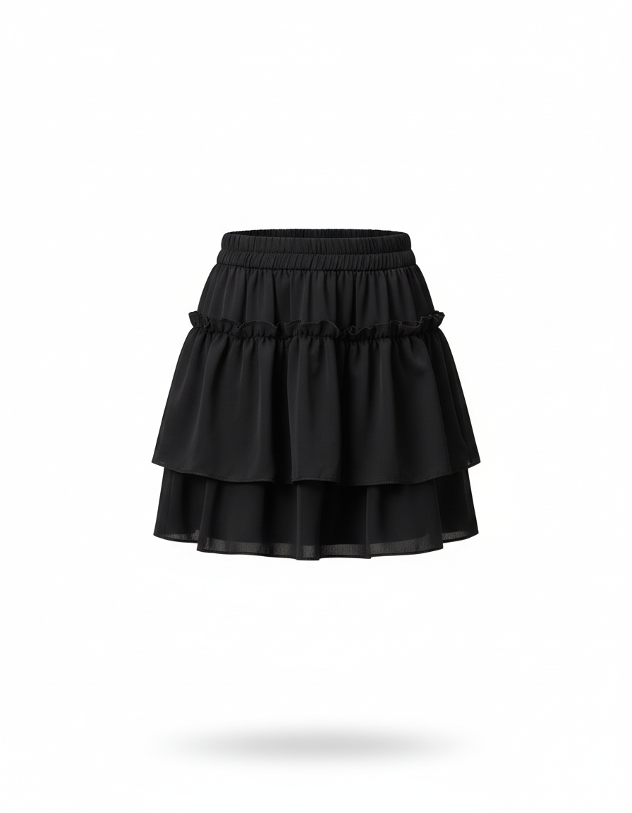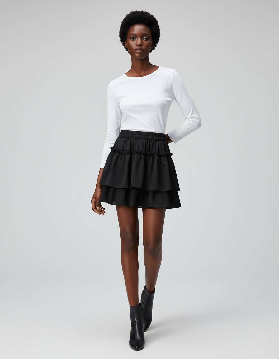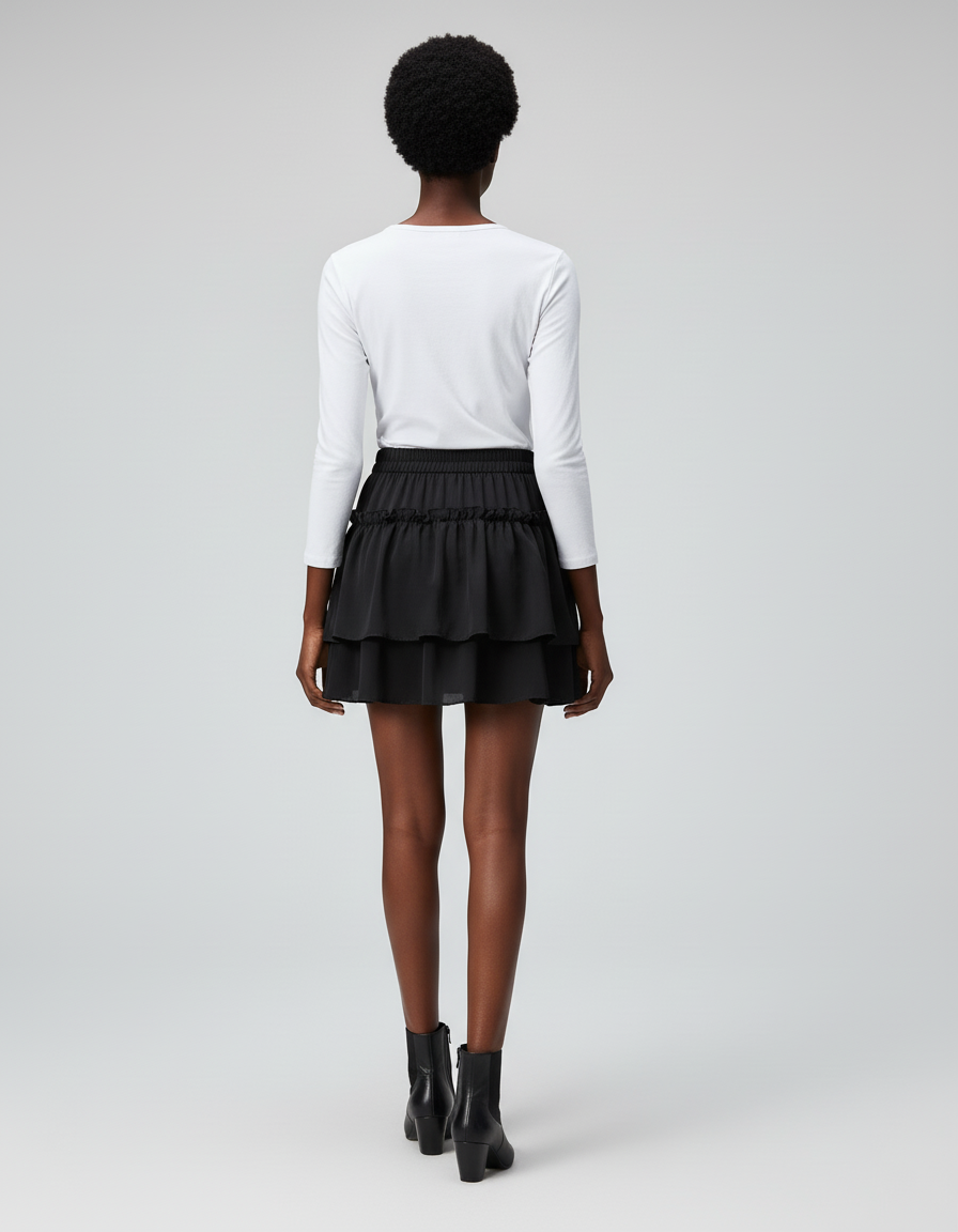 Ajoutez une touche de fantaisie chic à votre garde-robe avec cette jupe patineuse noire à volants, parfaite pour toutes les occasions.