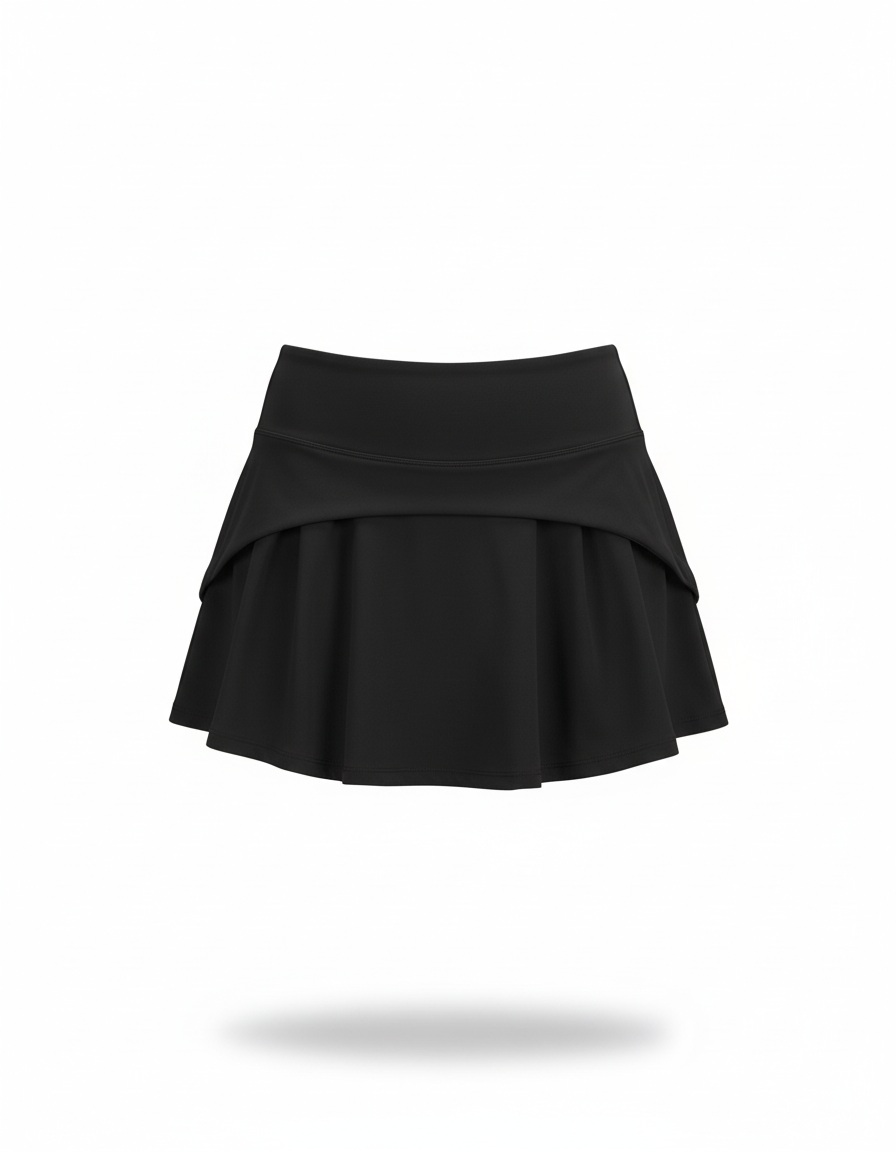 Cette jupe patineuse noire courte plissée se caractérise par une coupe évasée et un design superposé. Elle est de couleur noire et sa longueur arrive au-dessus du genou.