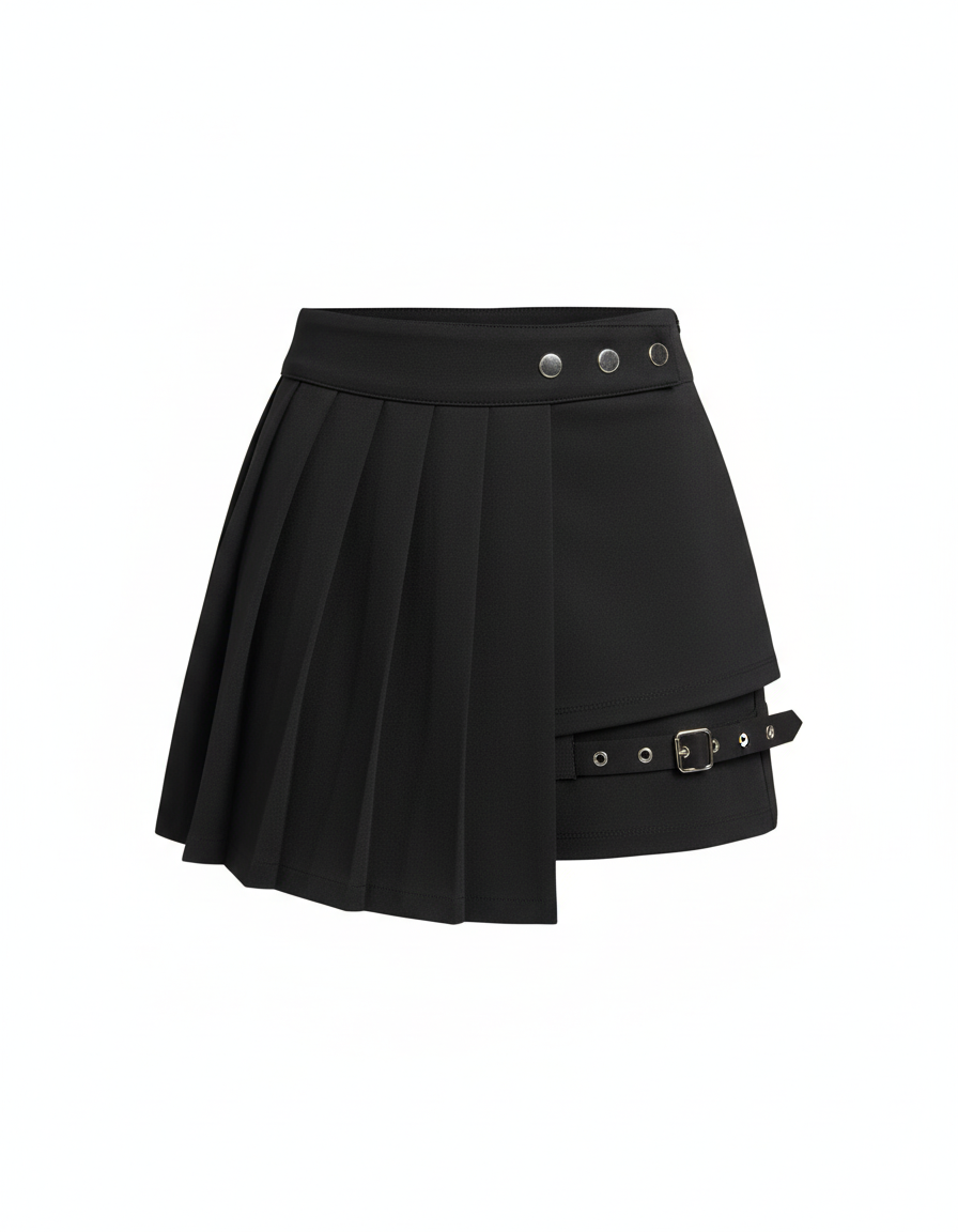 Cette jupe présente une coupe courte asymétrique, intégrant un côté plissé et un côté court de type short. Elle est de couleur noire et comporte des détails de sangle.