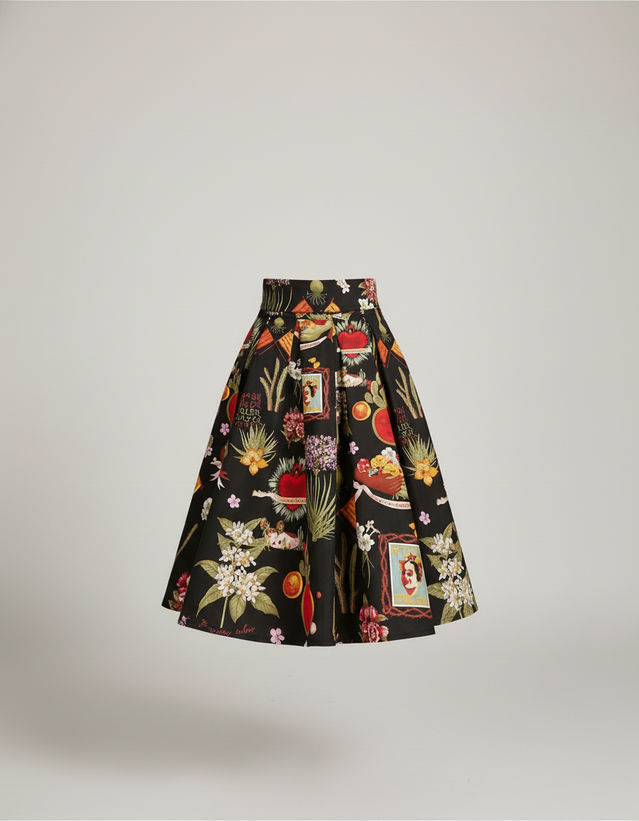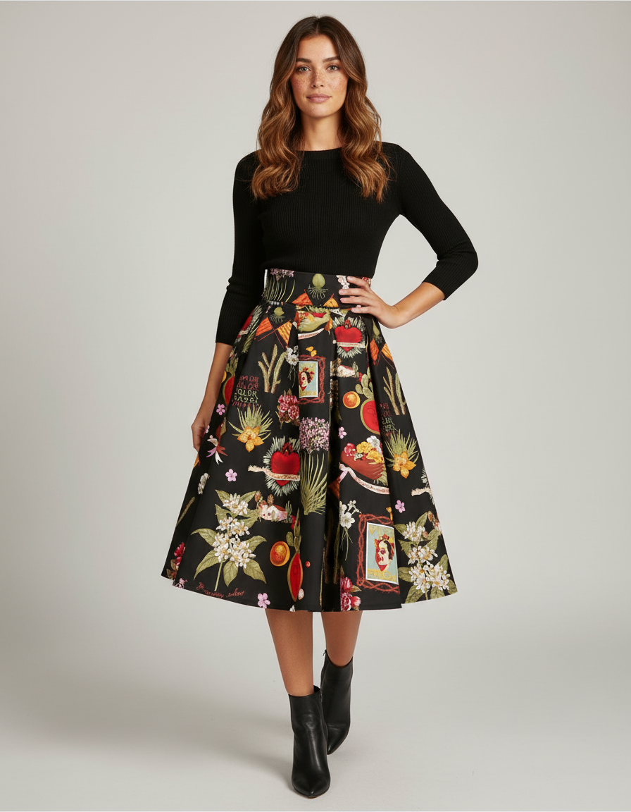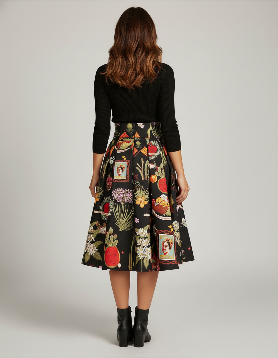 Évadez-vous de l'ordinaire avec notre Jupe Patineuse Noire Imprimée Artistique Plissée Vintage. Conçue pour la femme moderne qui refuse le conformisme, cette pièce maîtresse est une célébration de l'individualité et du style. Son imprimé vibrant, inspiré par l'art mexicain et ses symboles forts – cœurs sacrés, cactées fleuries et portraits énigmatiques – transforme chaque pas en une déclaration audacieuse. Idéale pour celles qui cherchent à infuser leur garde-robe d'une touche de poésie et d'exotisme, elle vous assure une allure incomparable, que ce soit pour une exposition d'art ou un dîner sophistiqué.