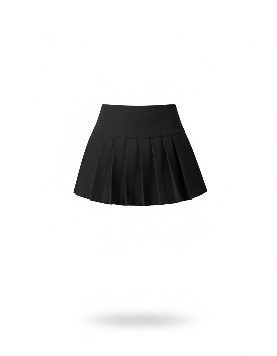 Cette jupe patineuse est de couleur noire et présente un design plissé. Elle a une coupe courte et se porte au-dessus du genou.