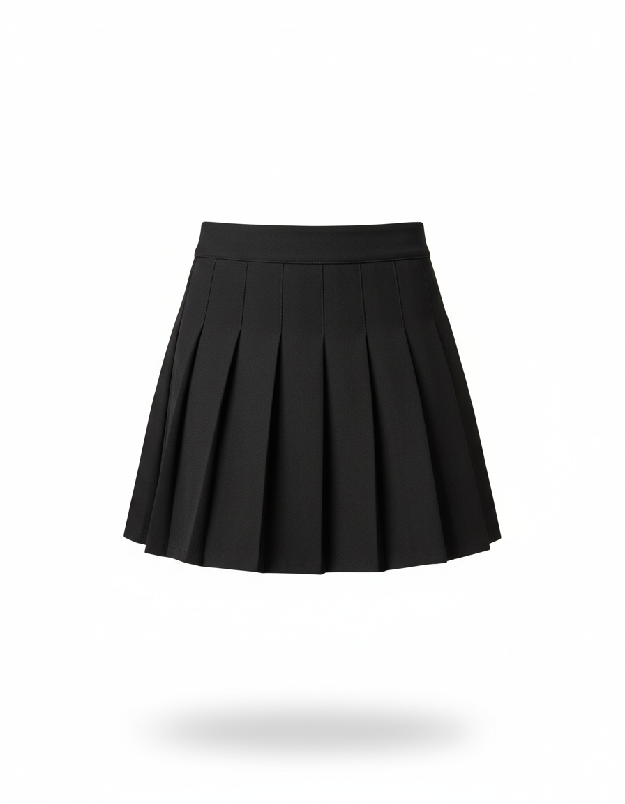 Une jupe courte de couleur noire, caractérisée par des plis réguliers. Sa coupe évasée s'étend à partir de la taille.