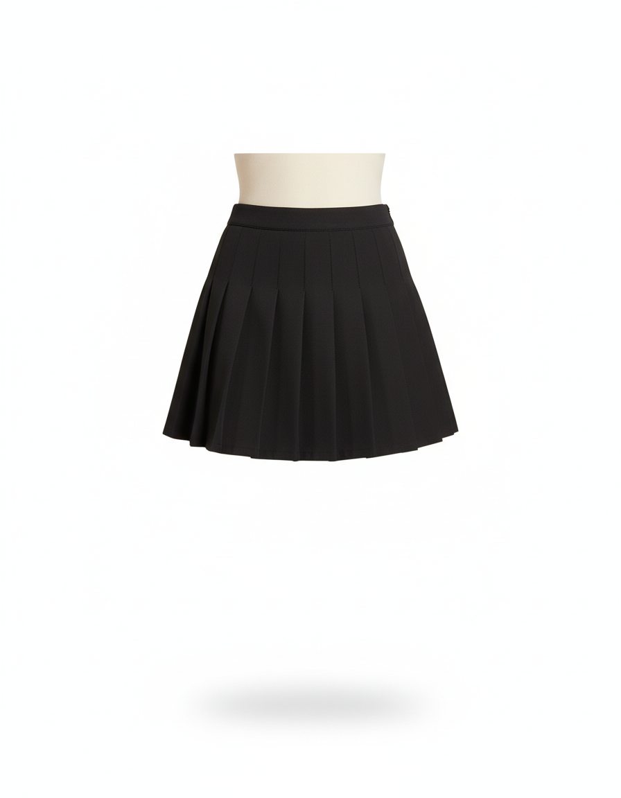 Cette jupe patineuse est de couleur noire unie. Elle intègre une coupe courte avec des plis réguliers.