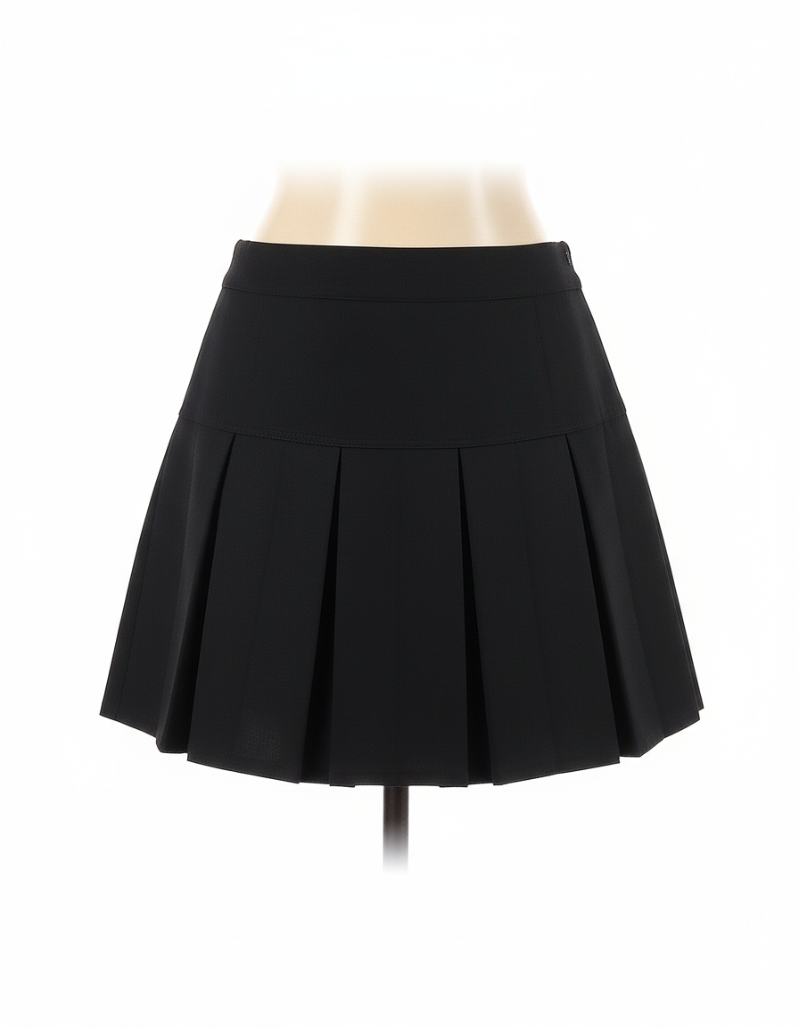 Cette jupe patineuse est de couleur noire et présente une coupe courte avec des plis réguliers. Elle arrive au-dessus du genou, avec une taille haute.