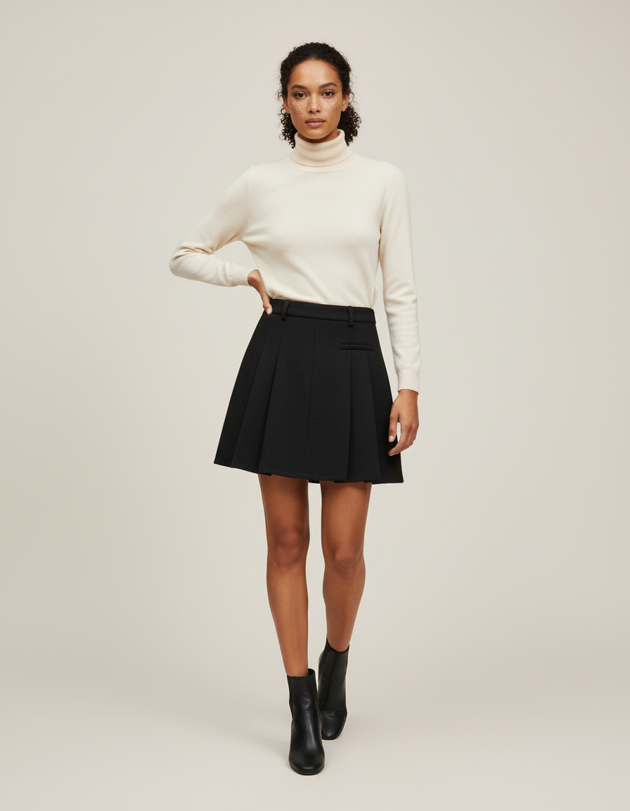 La Jupe Patineuse Noire Plissée Élégante Élancée est votre alliée parfaite pour une garde-robe sophistiquée et modulable. Conçue pour sublimer votre silhouette, son plissé impeccable en polyester haut de gamme offre un tombé fluide et une allure dynamique. Au bureau, associez-la à un chemisier en soie et des escarpins pour un professionnalisme affirmé. Pour une sortie décontractée chic, osez un pull en maille fine et des bottines, comme sur notre visuel, ou même des baskets épurées pour un contraste moderne. Sa polyvalence en fait une pièce maîtresse pour toutes les occasions.