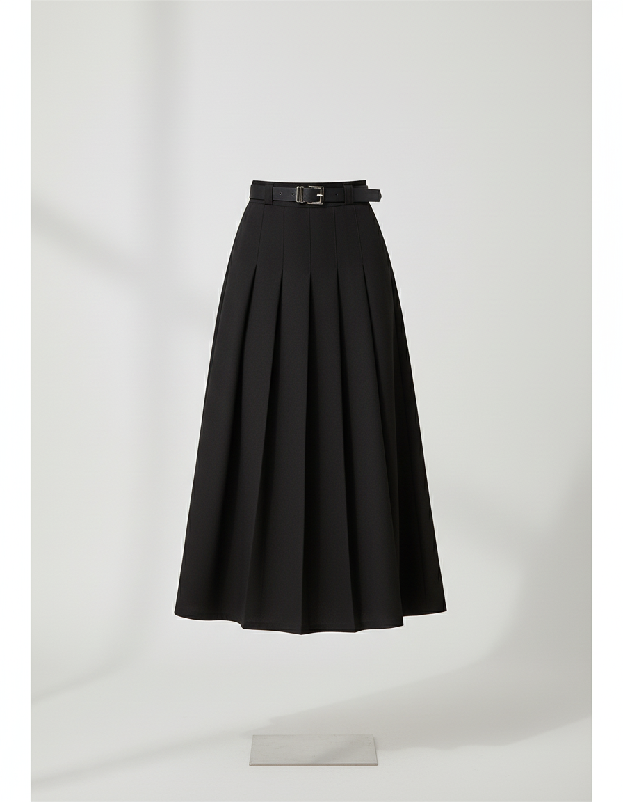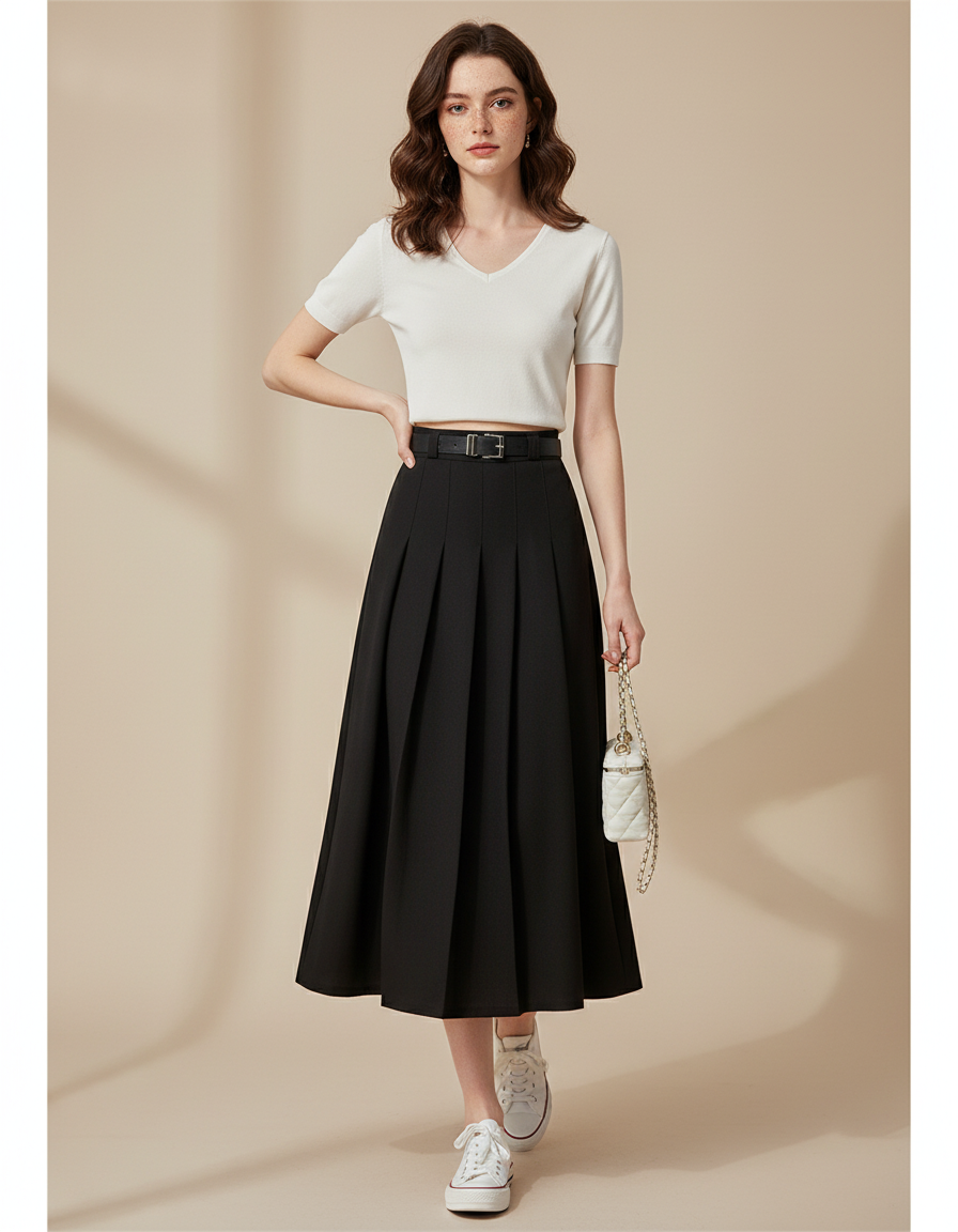 - Coupe : Taille haute avec une silhouette trapèze (A-line) et un design plissé.