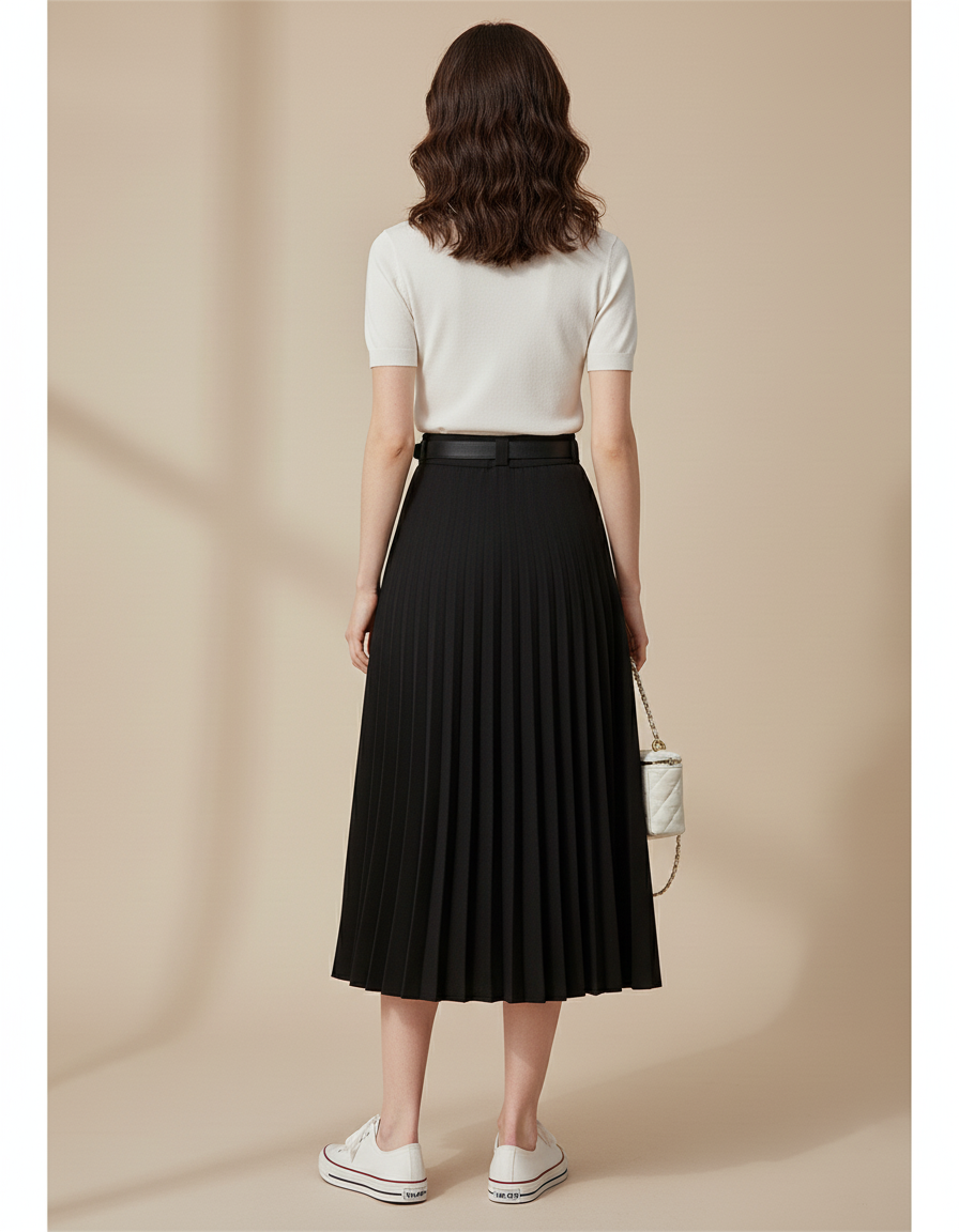 La Jupe Patineuse Noire Plissée Structurée est la pièce maîtresse d'une garde-robe moderne, conçue pour vous accompagner avec style et aisance du matin au soir. Son plissé impeccable et son tombé structuré, sublimés par un polyester de qualité, garantissent une silhouette élégante en toute circonstance. Pour un look décontracté-chic comme sur l'image, associez-la à un top en maille ajusté et des baskets blanches, parfait pour une journée active ou un brunch entre amis. Sa coupe évasée assure une liberté de mouvement exceptionnelle, vous permettant de vaquer à vos occupations avec un confort absolu, sans jamais compromettre votre allure.