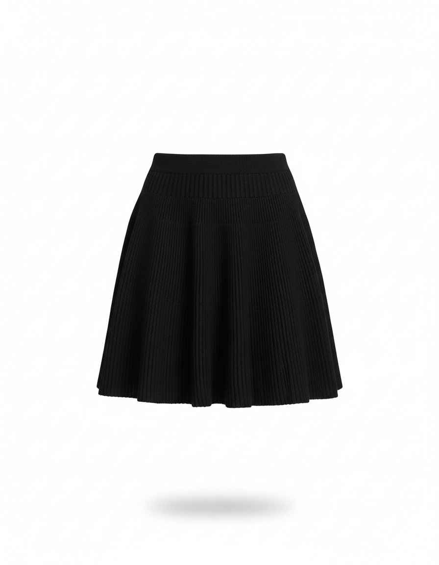 Cette jupe patineuse noire taille haute présente une coupe évasée. Elle est confectionnée dans un tissu à côtes.