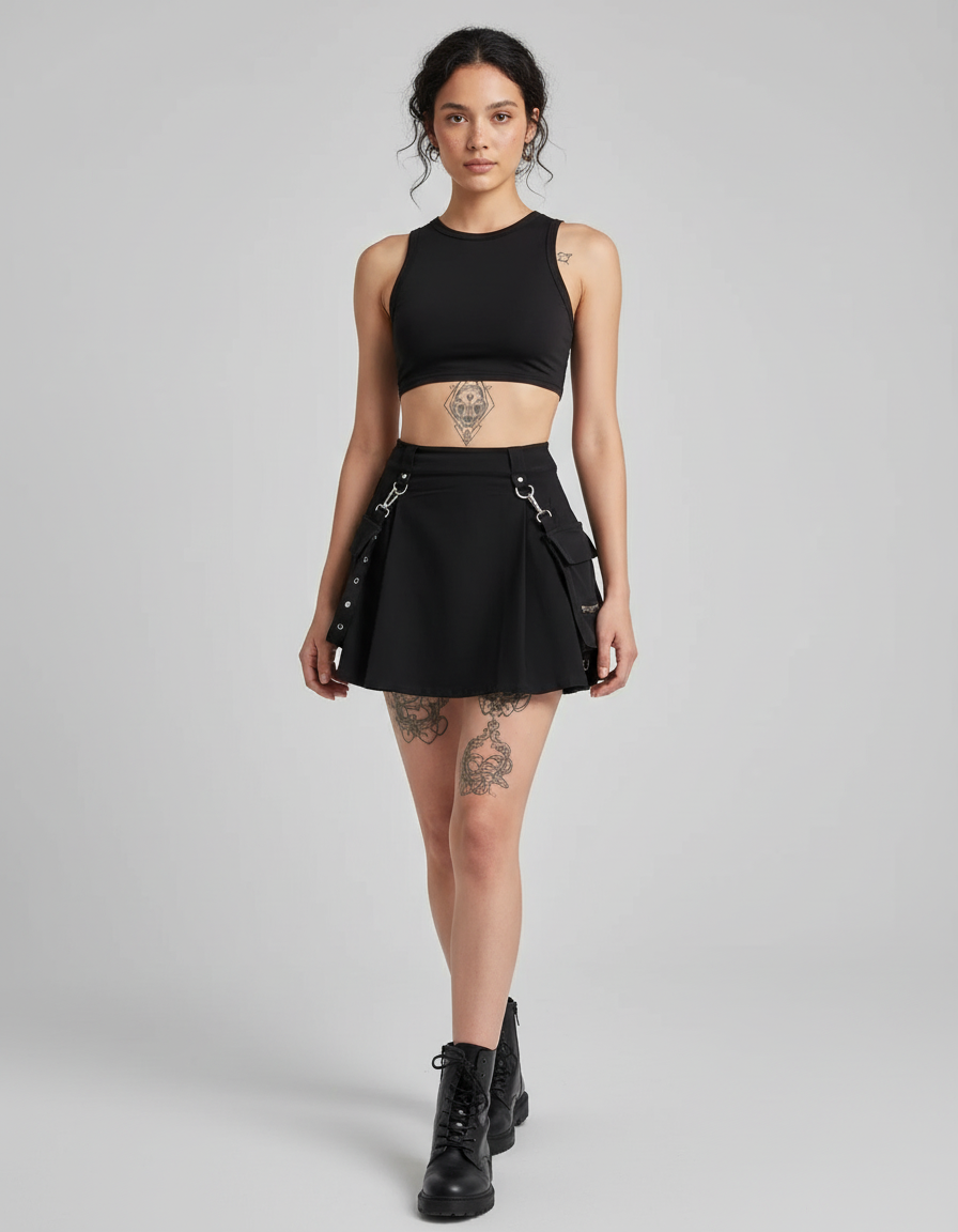 Adoptez un look audacieux et pratique avec cette jupe patineuse noire, parfaite pour un style utilitaire décontracté.