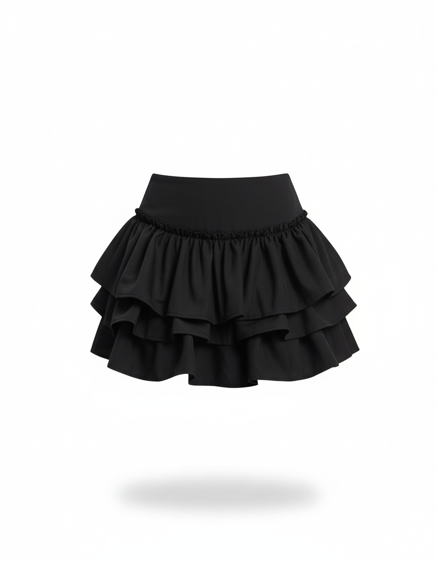 Cette jupe patineuse est de couleur noire et présente plusieurs rangées de volants. Sa coupe évasée part de la taille.