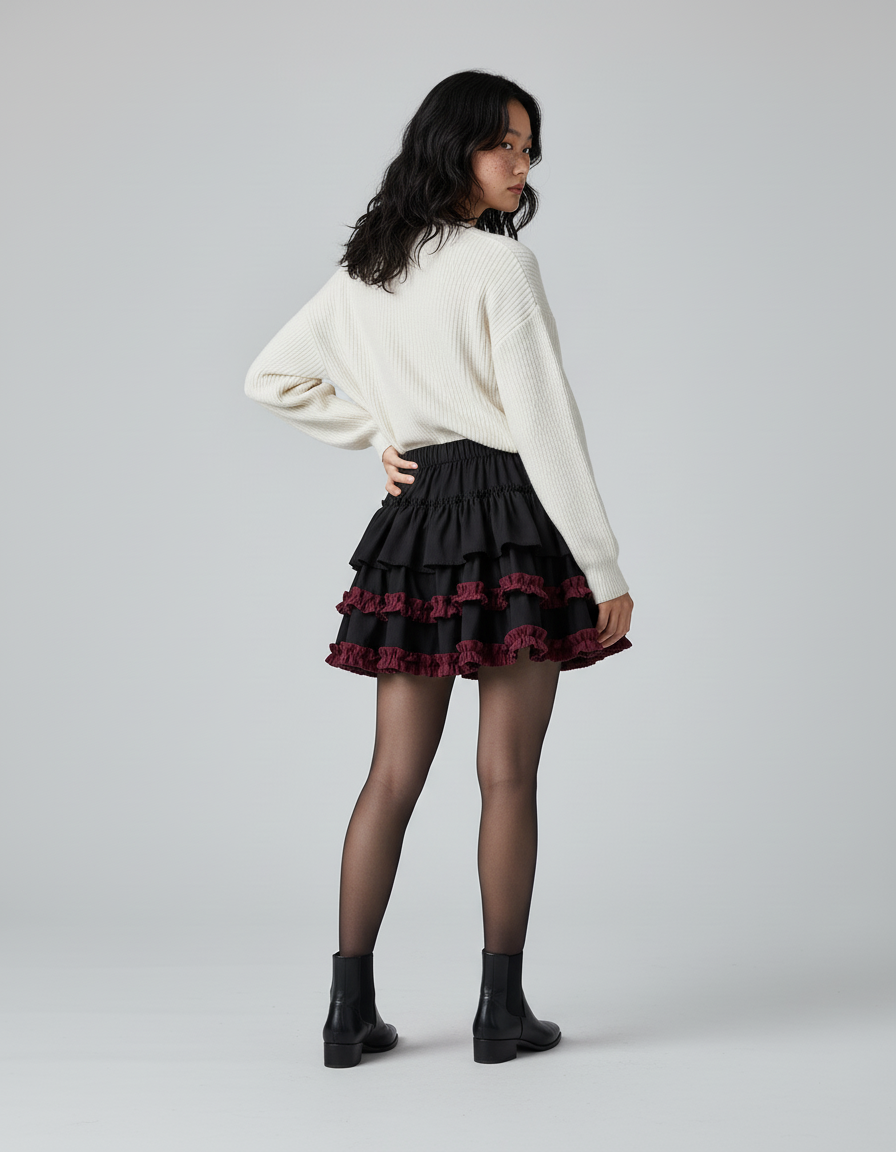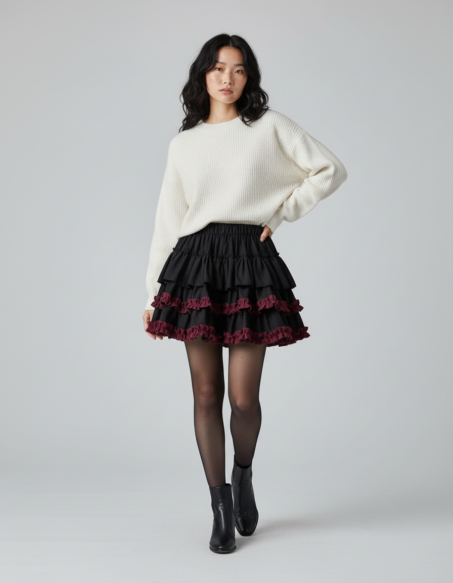 Ce qui la distingue ? Une superposition délicate de volants plissés en polyester noir de haute qualité, magnifiée par un liseré bordeaux profond qui révèle un sens aigu du détail et une sophistication discrète. Loin des classiques, cette jupe patineuse réinterprète le style romantique avec une modernité assumée. Elle se prête à toutes les envies, qu'elle soit associée à un pull douillet pour un look hivernal chic ou à un chemisier léger pour une allure printanière. Une pièce versatile qui affirme votre goût pour l'exceptionnel et votre sens inné du style.