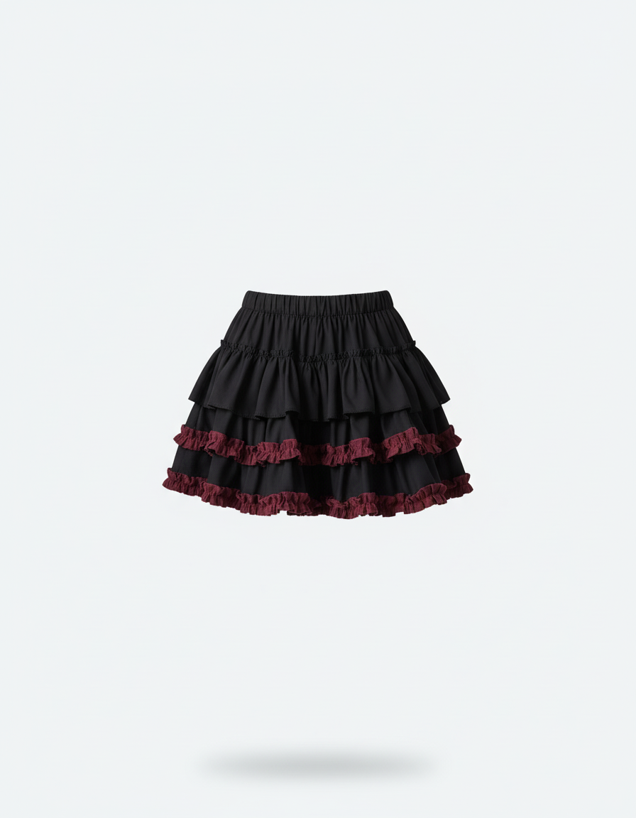 Cette jupe courte présente une coupe évasée avec des volants superposés. Elle est de couleur noire avec des détails de volants bordeaux.