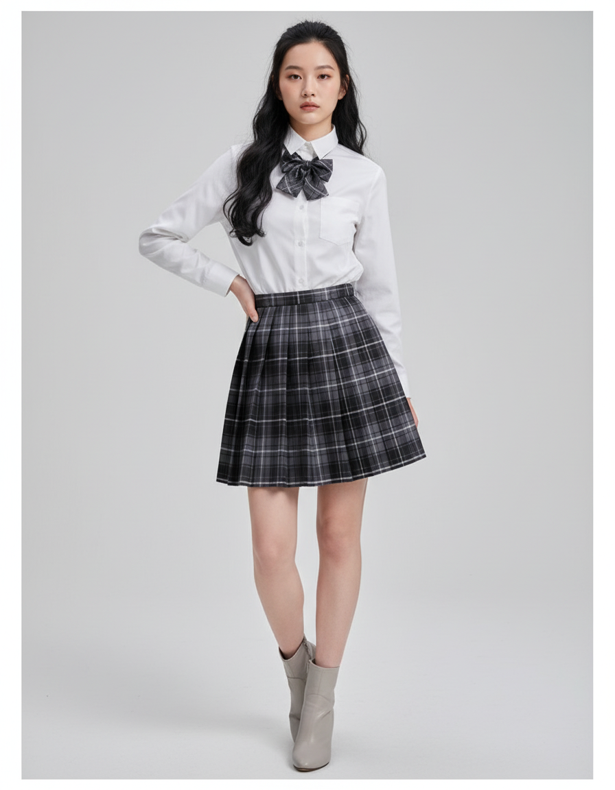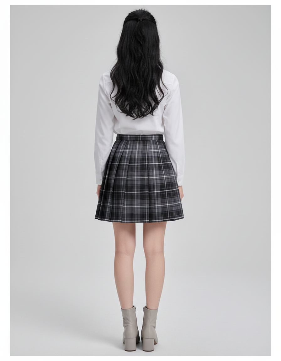 La Jupe Patineuse Plissée Carreaux est une pièce maîtresse pour une garde-robe polyvalente, s'adaptant à toutes vos envies. Son motif intemporel gris et noir s'intègre parfaitement, que ce soit pour une journée active ou une occasion spéciale. Pour un look quotidien chic et sans effort, associez-la à une chemise blanche immaculée et des bottines élégantes, comme sur l'image, ou un pull fin en maille pour les journées plus fraîches. En soirée, transformez-la avec un top en soie et des talons pour une allure sophistiquée. Pour une touche plus audacieuse, osez le perfecto en cuir et des baskets montantes : un contraste parfait qui affirme votre style.
