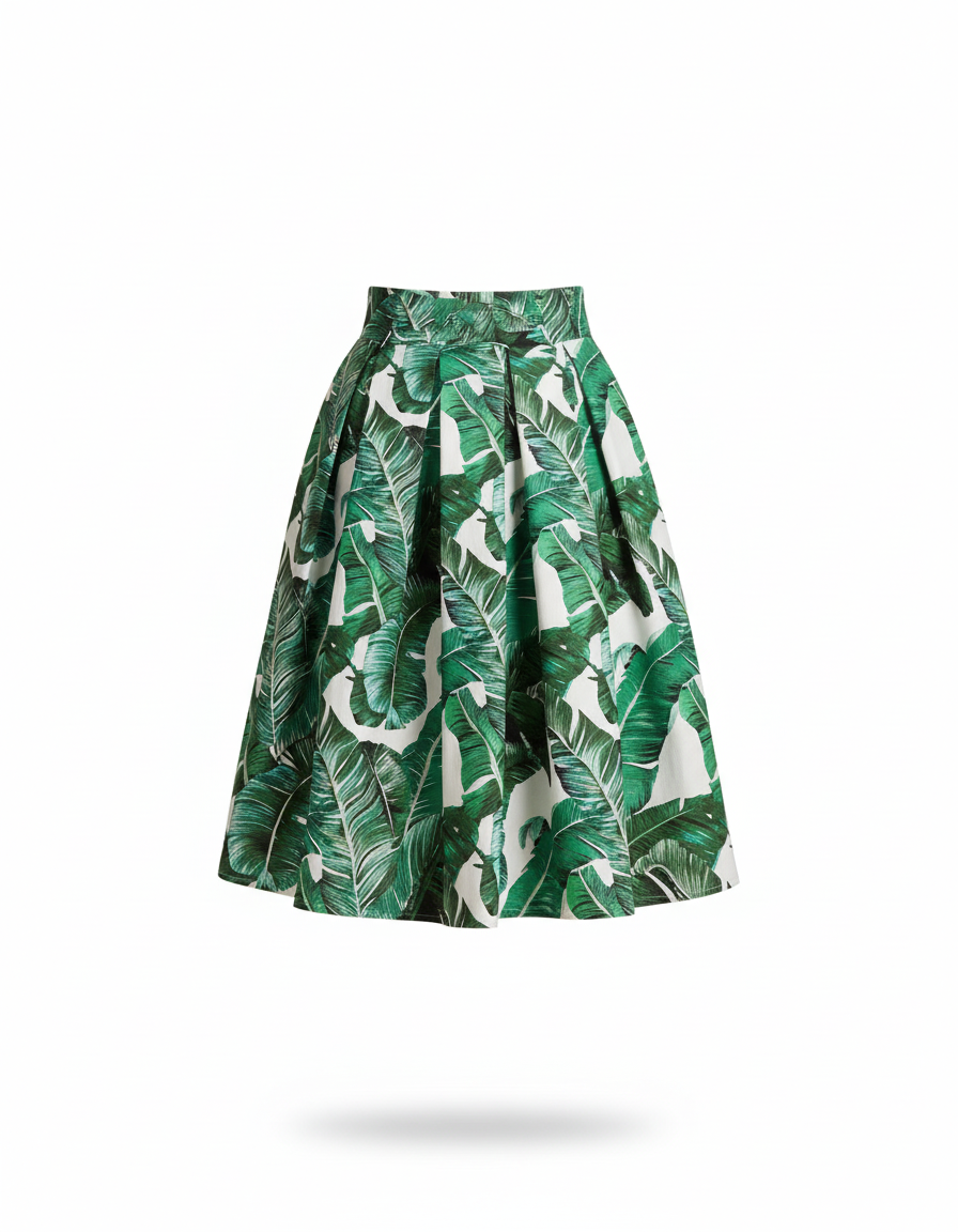 Cette jupe présente une coupe patineuse avec des plis marqués. Elle affiche un motif tropical composé de feuilles vertes sur un fond blanc.