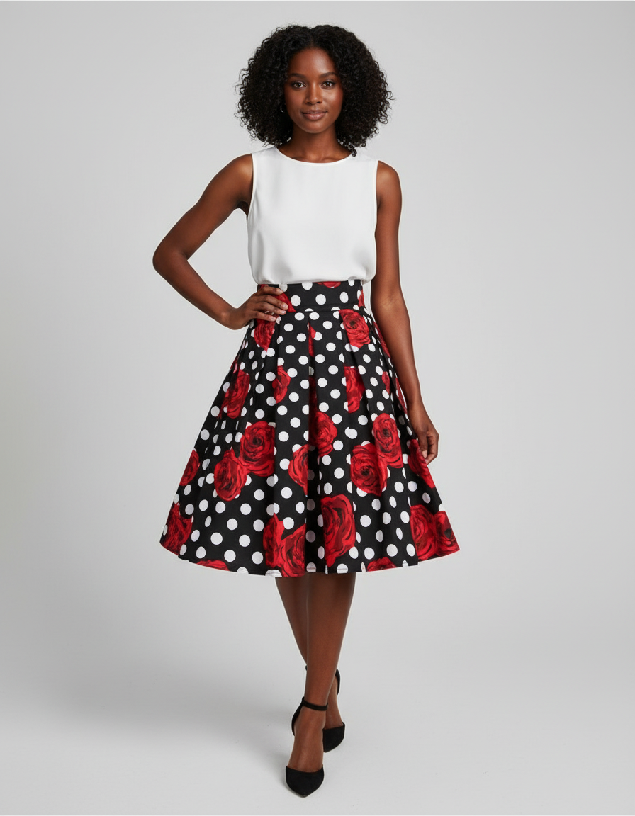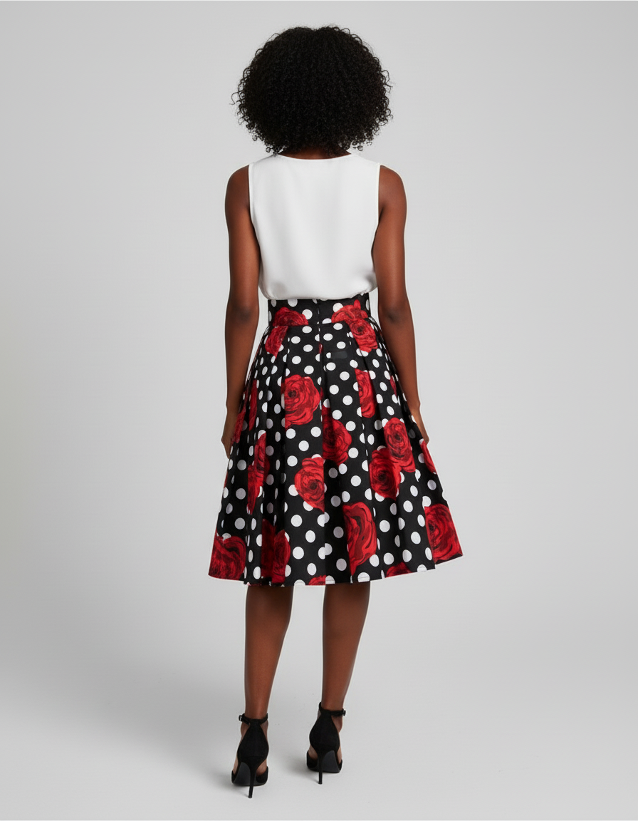 Cette jupe patineuse présente un motif à pois blancs sur fond noir avec des roses rouges. Sa coupe est plissée et évasée.