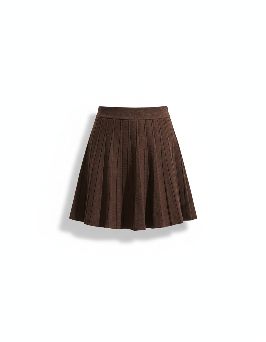 Cette jupe patineuse est un modèle court et plissé, confectionné en tissu tricoté de couleur marron.