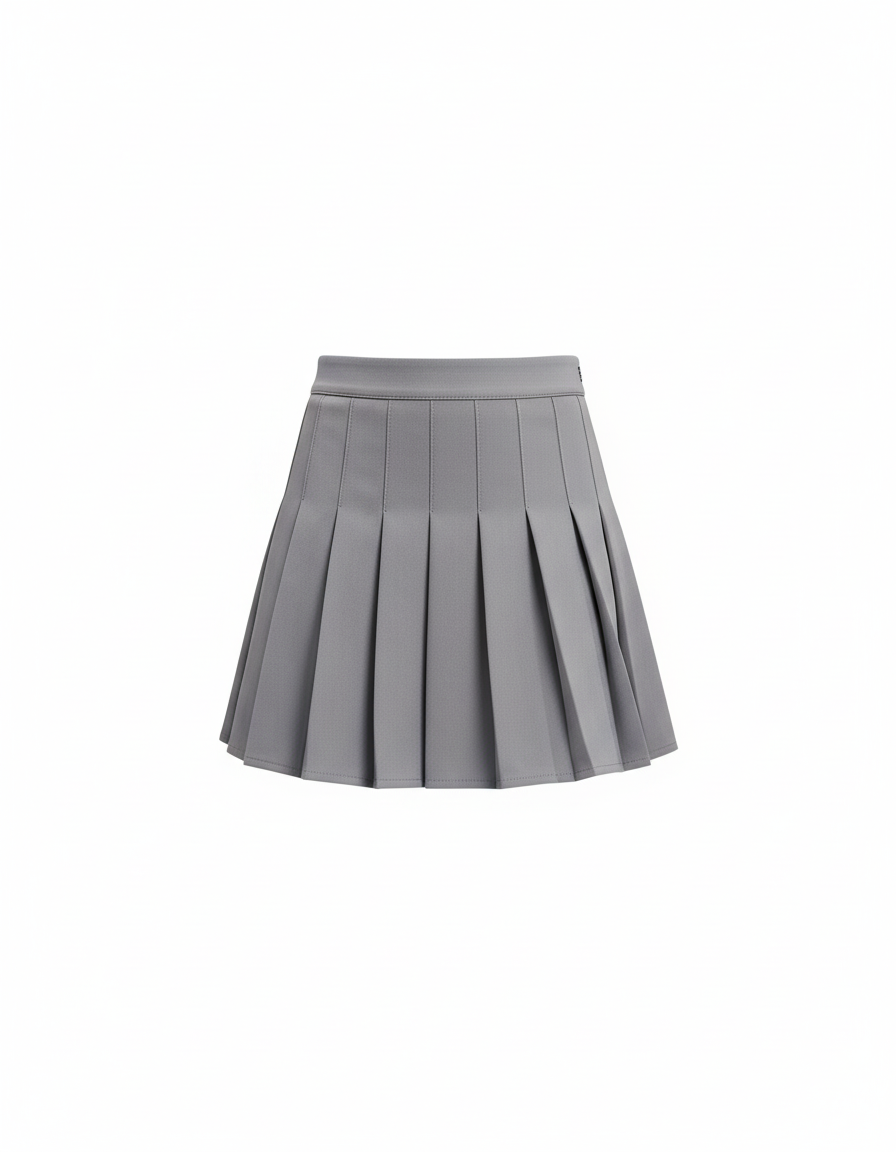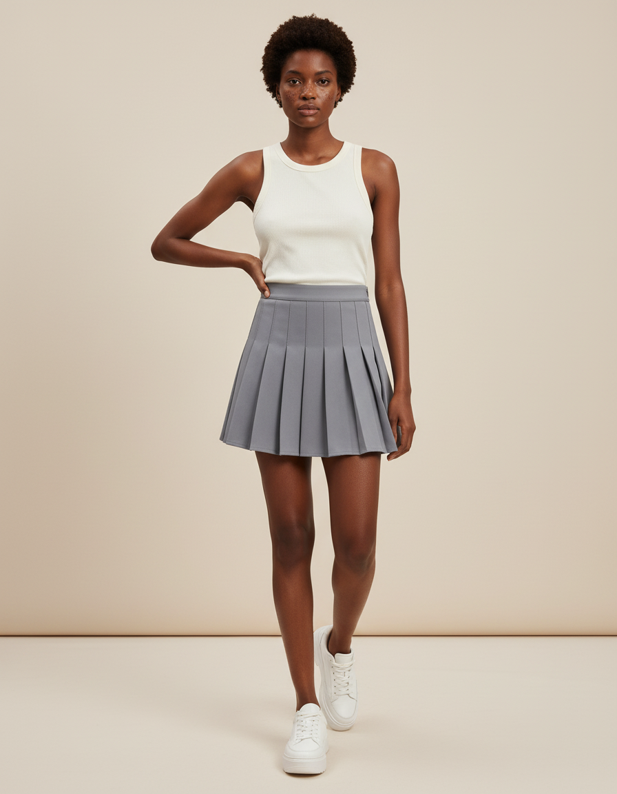 Cette jupe patineuse présente une coupe courte avec des plis marqués. Elle est de couleur grise unie.