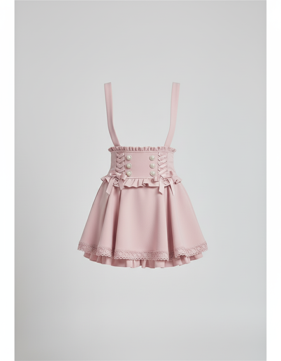 Cette jupe patineuse rose est munie de bretelles et présente une taille haute décorée de boutons et de lacets.