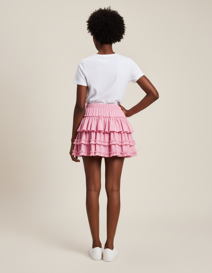 Adoptez un look frais et féminin avec notre jupe patineuse rose à volants, parfaite pour toutes vos envies estivales.