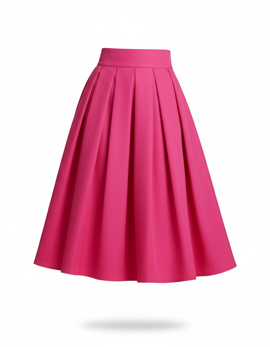 Cette jupe patineuse présente une coupe évasée avec des plis structurés. Elle est de couleur rose vif et atteint une longueur midi, s'arrêtant sous le genou.