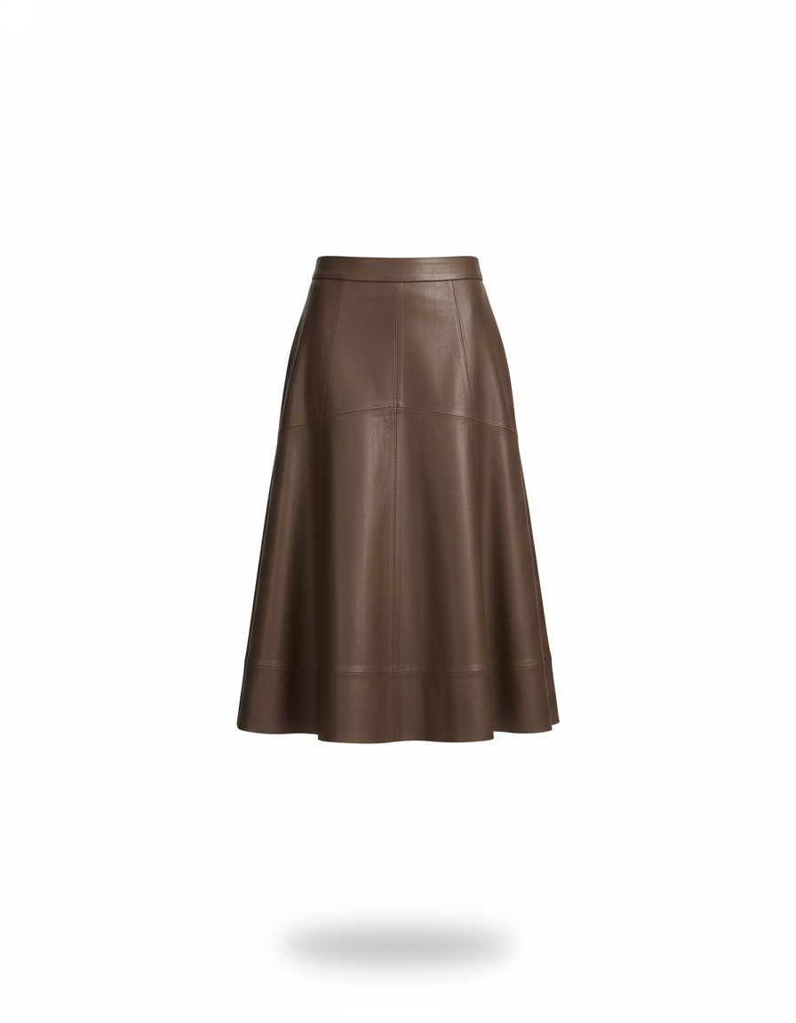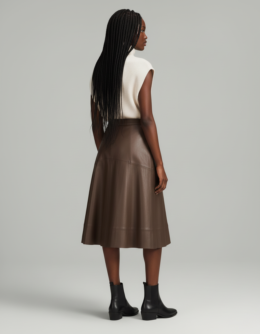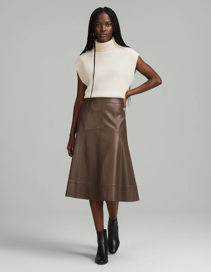 Adoptez la sophistication sans effort avec notre Jupe Patineuse Simili Cuir Mi Longue. Sa teinte marron riche et sa coupe évasée en font une pièce maîtresse pour un look chic et professionnel. Idéale pour le bureau, associez-la à un col roulé crème et des bottines pour une allure contemporaine, ou à une blouse fluide et un blazer ajusté pour une élégance classique. Le simili cuir haut de gamme offre une texture douce et un rendu visuel des plus raffinés, garantissant une silhouette impeccable en toutes circonstances.