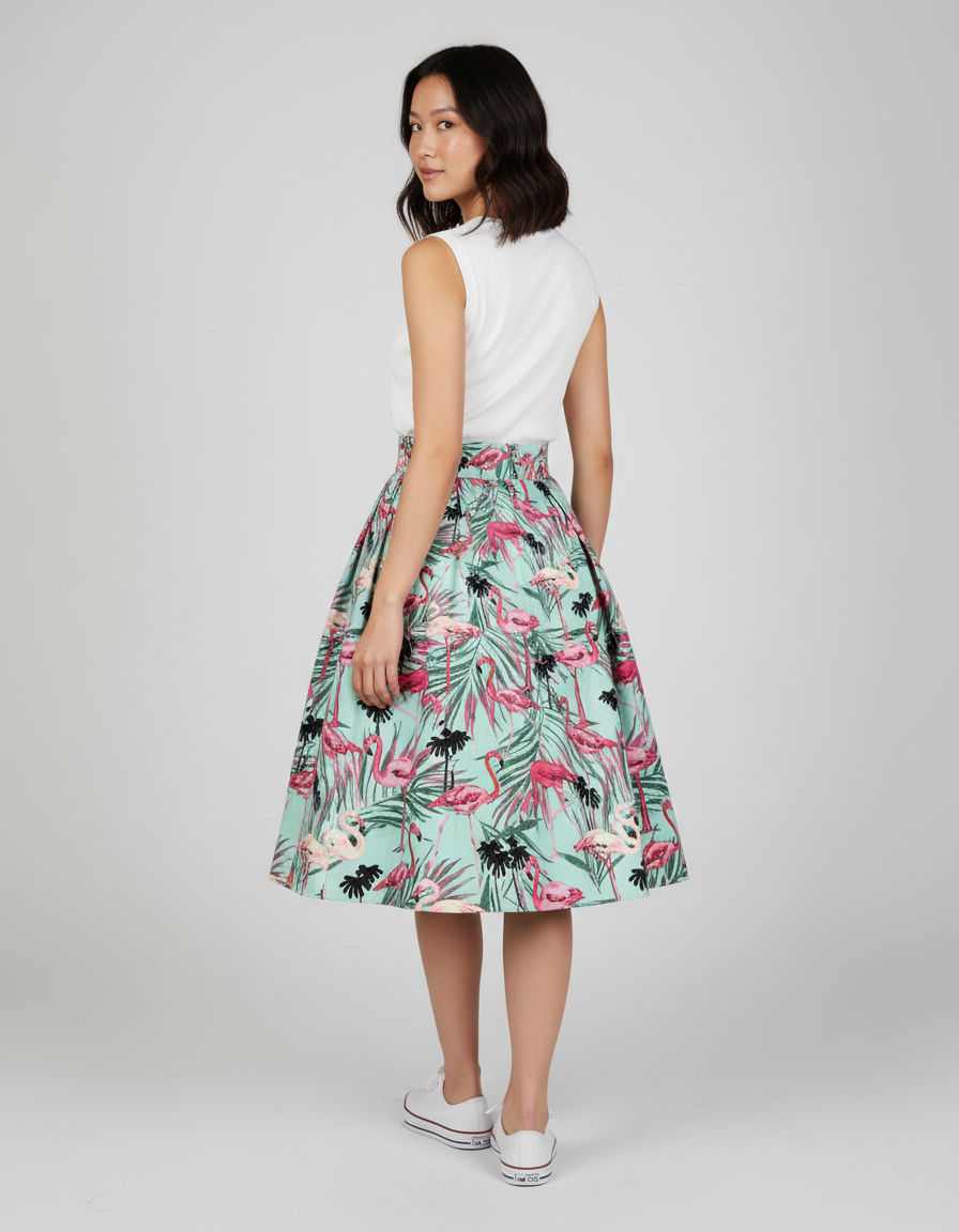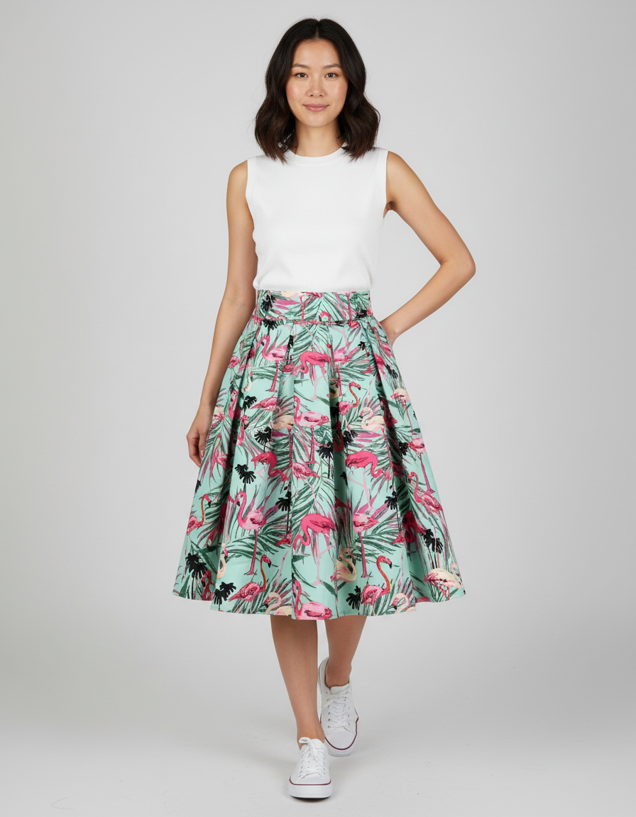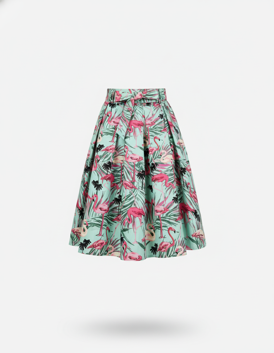 Cette jupe patineuse présente un motif tropical avec des flamants roses et une coupe plissée. Elle est conçue pour un style décontracté.