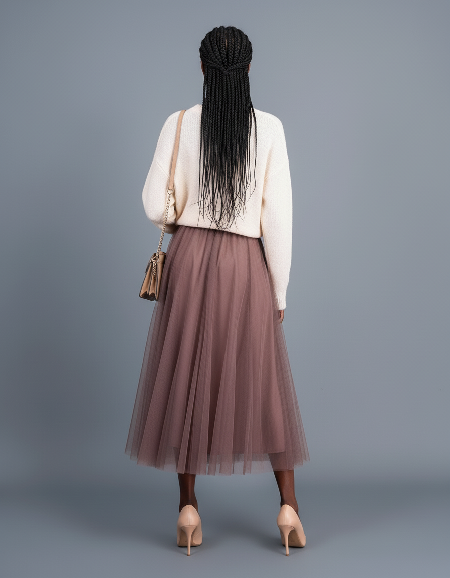 Ce qui distingue notre Jupe Patineuse, c'est son tombé parfait et la qualité exceptionnelle de son tulle, qui crée un mouvement fluide et aérien à chaque pas. Sa coupe patineuse flatte toutes les silhouettes, offrant une liberté de mouvement inégalée. Idéale pour un événement chic, un brunch décontracté ou pour sublimer votre quotidien, elle se marie aisément avec un pull douillet pour un look hivernal moderne ou un chemisier soyeux pour une touche plus formelle. C'est la pièce versatile et luxueuse qui manquait à votre collection.